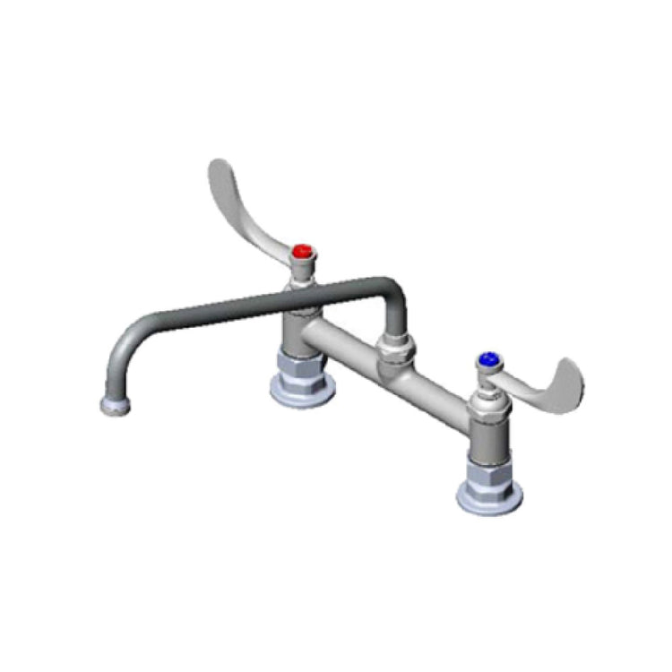 The T&S Brass B-0221-WH4 Pantry Mixing Faucet is a meticulously designed double deck mount fixture, ideal for commercial and industrial kitchens. Engineered with 8-inch adjustable centers, this faucet ensures a perfect fit for various installations. The 12-inch swing nozzle, model 062X, allows for unmatched flexibility and reach, making it suitable for diverse kitchen tasks. It features 4-inch wrist handles with color-coded indexes, enhancing user-friendliness and ease of operation. The stream regulator tip provides efficient water flow control, while the quarter-turn Eterna cartridges with spring checks ensure durability and reliability. The faucet's adjustable flange allows for customized installation, catering to specific user needs. Its polished chrome-plated body not only provides a sleek appearance but also ensures long-lasting performance. With a 1/2-inch NPT connection, it integrates seamlessly into existing plumbing systems. Furthermore, this faucet is low lead content certified and ADA compliant, meeting stringent safety and accessibility standards. The T&S Brass B-0221-WH4 is a versatile option, bridging the gap between robust construction and user-centric design, making it a valuable addition to any professional kitchen environment where precision and dependability are paramount.