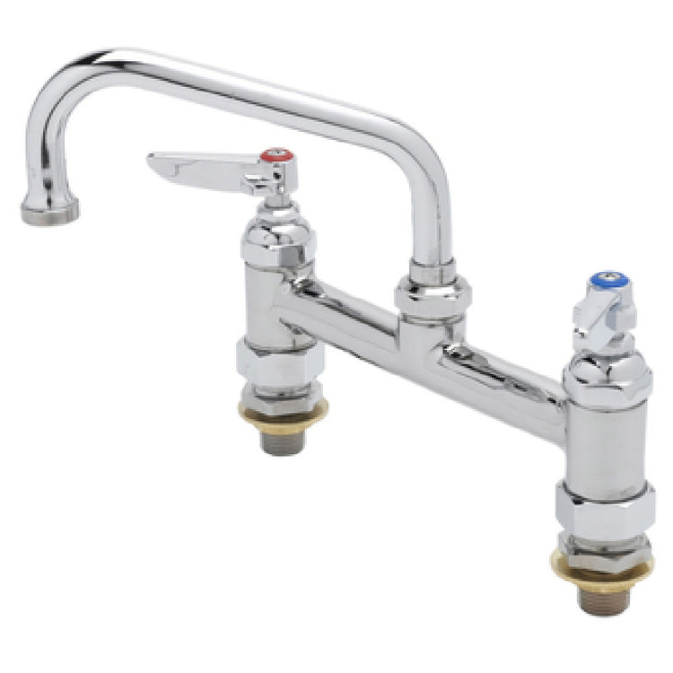 The T&S Brass B-0222-CC Mixing Faucet is a deck-mounted plumbing fixture specifically designed to meet the diverse needs of commercial kitchens and similar environments. Featuring a 6-inch swing nozzle, this faucet provides flexibility and ease of use in various applications. The B-0222-CC model is equipped with 8-inch centers on the deck faucet, ensuring compatibility with standard installations. It boasts 1/2" IPS CC male inlets, facilitating a secure and efficient connection to existing plumbing systems. This faucet utilizes quarter-turn Eterna cartridges with spring checks, which ensure a reliable and smooth operation, minimizing wear and tear over time. The inclusion of lever handles allows for intuitive and effortless control of water flow and temperature. Notably, this T&S Brass faucet is designed with a low lead content, meeting stringent safety standards and making it a responsible choice for water quality. Additionally, the model is ADA Compliant, highlighting its commitment to accessibility and usability for all individuals. The T&S Brass B-0222-CC Mixing Faucet is a dependable solution for professionals seeking a durable, high-performance fixture that aligns with industry standards and regulatory requirements.