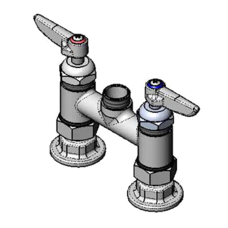 The T-S Brass B-0225-CR-LN Pantry Mixing Faucet Double Deck Mount is a robust and versatile fixture tailored for diverse needs across the foodservice and hospitality industry. Engineered with precision, this faucet features a double deck mount with a 4-inch center-to-center installation, providing stability and ease of use in various kitchen environments. It is equipped with lever handles, allowing for effortless operation, and the inclusion of quarter-turn Cerama cartridges enhances its durability and performance. Notably, this model is supplied without a nozzle, offering flexibility for users to customize according to specific requirements. The 1/2-inch NPT connection ensures a secure fit, reducing the risk of leaks and maintenance issues. Compliant with low lead requirements, this faucet aligns with health and safety regulations, making it a reliable choice for establishments prioritizing compliance. Additionally, its ADA compliance underscores its accessibility, catering to all users by ensuring ease of use for individuals with disabilities. The T-S Brass B-0225-CR-LN stands out as a dependable and adaptable solution, meeting the rigorous demands of professional kitchens with its blend of functionality and compliance.