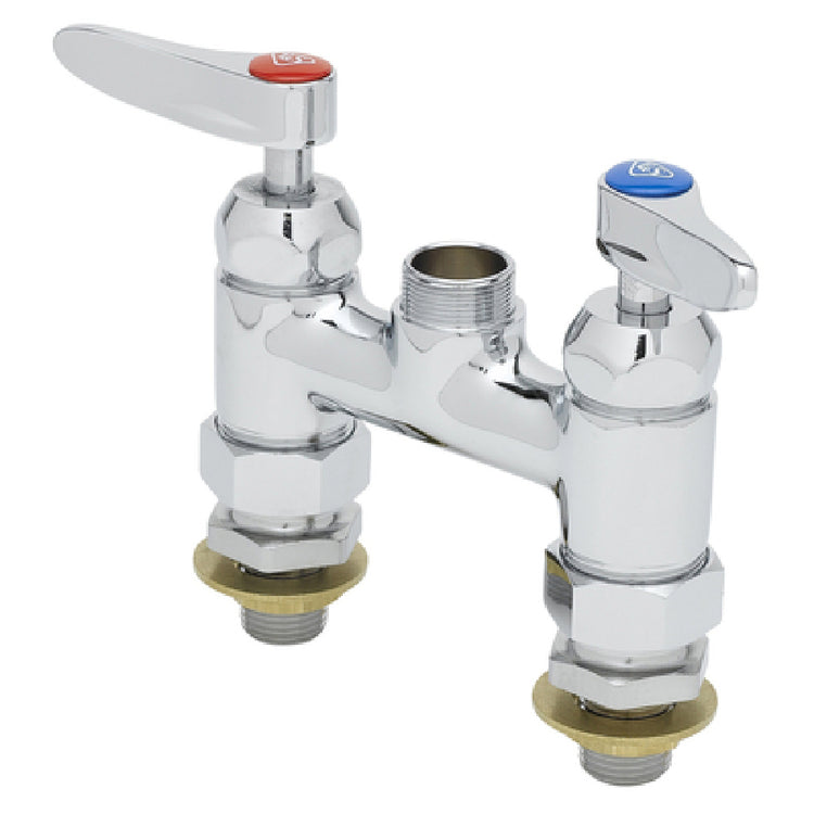 The T&S Brass B-0225-LN-CC-CR Double Pantry Faucet Deck Mount 4" OC is a meticulously engineered fixture designed for diverse commercial applications. This faucet, characterized by its deck mount configuration with a 4-inch on-center setup, comes without a nozzle but includes user-friendly lever handles for smooth operation. The inclusion of quarter-turn Cerama cartridges ensures durability and precision in water control, making it an efficient choice for high-demand environments. The faucet is equipped with 1/2" NPT male inlets, facilitating straightforward installation in compatible plumbing systems. A standout feature is its low lead construction, aligning with rigorous safety standards to ensure safe water flow. Furthermore, the T&S Brass B-0225-LN-CC-CR is ADA compliant, catering to accessibility needs and broadening its usability across various segments within the food service and hospitality industries. This faucet combines robust functionality with safety, making it a reliable choice for establishments that prioritize both quality and compliance. Its thoughtful design caters to the needs of modern commercial spaces, ensuring it meets both operational demands and regulatory standards effectively.