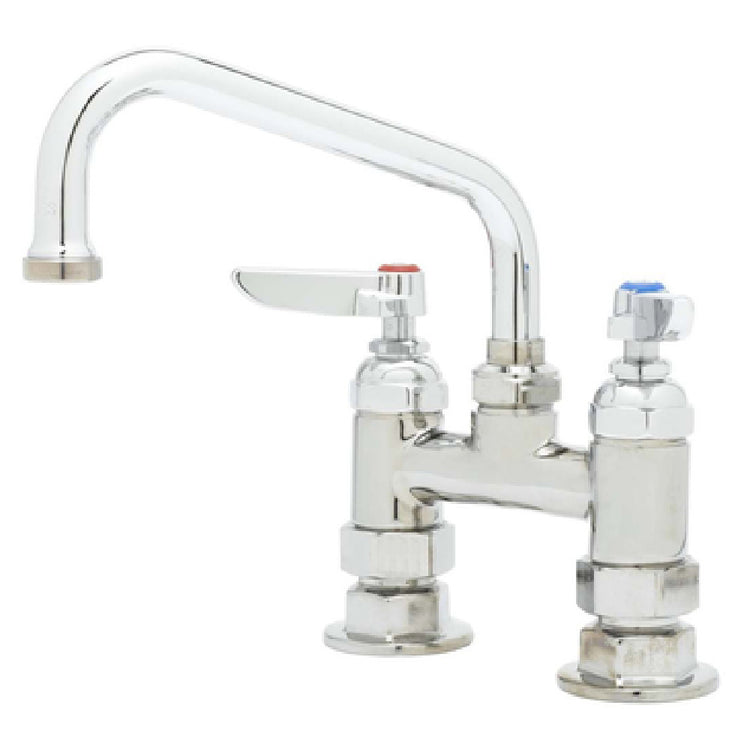 The T&S Brass B-0227 Mixing Faucet Deck Mount 8" Swing Nozzle combines functionality and compliance, making it an essential fixture in various commercial and industrial settings. Designed for versatility, this faucet features an 8-inch swing nozzle and is configured for deck mount installations, ideal for kitchen and utility sinks. The unit is constructed with 4-inch centers and 1/2-inch IPS eccentric flanged female inlets, ensuring a flexible fit for diverse plumbing applications. This mixing faucet incorporates quarter-turn Eterna cartridges, known for their durability and smooth operation, which enhance user experience and reduce maintenance needs. It is equipped with lever handles that are easy to operate, providing precision control over water flow and temperature. The faucet also includes a 1/2-inch NPT connection, supporting seamless integration into existing systems. Notably, it is low lead compliant, aligning with health and safety standards, and ADA Compliant, which ensures accessibility for all users. The T&S Brass B-0227 stands out as a reliable and adaptable solution for businesses requiring robust and compliant water fixtures, combining essential features with the assurance of long-lasting performance.