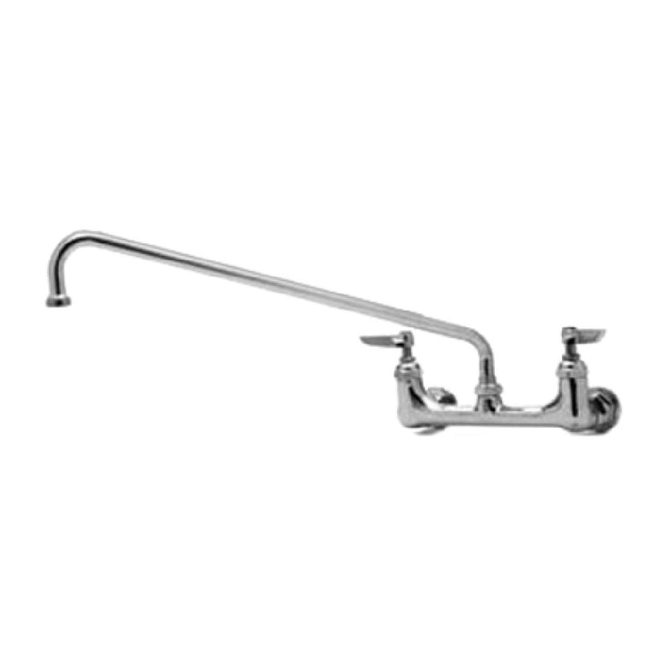 The T&S Brass B-0230-LNM Sink Mixing Faucet is a wall-mounted fixture designed with 8-inch adjustable centers for versatile installation. Notably, it lacks a nozzle, allowing customization with T&S swing nozzles for varied applications. Featuring quarter-turn Eterna cartridges with spring checks, this faucet ensures long-lasting reliability and ease of use. The lever handles are equipped with color-coded indexes, enhancing user convenience and operational clarity. Its swivel outlet includes a lock washer, providing stability for rigid applications. The faucet is engineered with 1/2-inch NPT female eccentric inlets and 2-inch diameter flanges, offering compatibility with diverse plumbing systems. Constructed from polished chrome-plated brass, the unit boasts a sleek appearance while upholding durability and low lead compliance. ADA compliance ensures accessibility aligns with industry standards. Certified by cCSAus, this faucet meets rigorous quality benchmarks. Packaged six per master pack, it caters to commercial needs. The T&S Brass B-0230-LNM Sink Mixing Faucet excels in settings ranging from commercial kitchens to healthcare facilities, delivering reliability and adaptability to meet diverse operational demands.