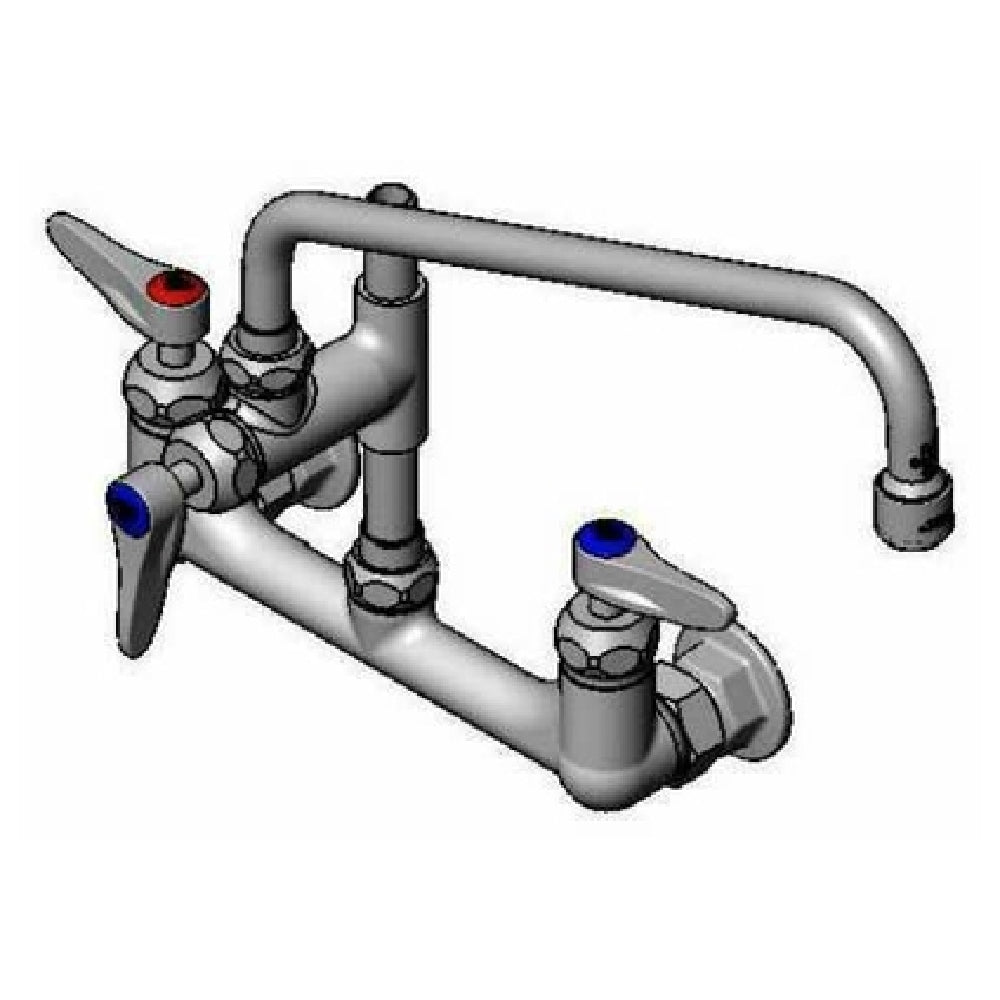 The T&S Brass B-0231-A12CR-GE Pantry Faucet Double Wall Mount is a highly functional and efficient fixture designed for versatile use in various commercial settings. It features an 8-inch center wall mount configuration, providing a sturdy installation for heavy-duty operations. The faucet comes with a 12-inch swing nozzle and a 1.0 GPM VR aerator, ensuring precise water flow and conservation. Lever handles with color-coded indexes facilitate easy operation and user convenience. This model is equipped with quarter-turn Cerama cartridges, which enhance durability and provide smooth operation. The faucet includes an additional 2-inch riser and 1/2-inch NPT female inlets, allowing for flexible installation options. Its construction adheres to low lead standards and is both cCSAus and ADA Compliant, meeting essential safety and accessibility requirements. The T&S Brass B-0231-A12CR-GE is engineered to deliver reliability and performance, making it a valuable addition to any pantry or commercial kitchen environment. Its design and technical specifications cater effectively to the needs of various segment markets within the food service industry, ensuring both compliance and efficiency.