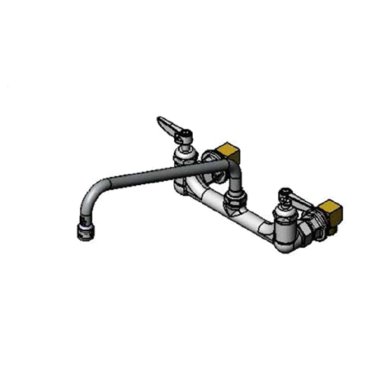 The T&S Brass B-0231-CR-K-F10 Pantry Faucet Double 8" Wall Mount is a high-performance fixture designed for commercial kitchen environments, providing both durability and efficiency. This faucet features a double 8-inch wall mount installation, enhancing stability and ease of use. The 12-inch swivel nozzle grants flexibility and extended reach, ideal for a variety of tasks within demanding kitchen settings. Engineered with quarter-turn Cerama cartridges, complete with check valves, it ensures smooth operation and longevity, even in high-use scenarios. The lever handles are ergonomic, facilitating effortless control over water flow and temperature adjustments. Included are two 24-inch flexible hoses and a comprehensive installation kit, simplifying the setup process. The faucet is equipped with a 1.0 GPM aerator, promoting water conservation without sacrificing performance. It is constructed to meet low lead standards, ensuring compliance with stringent safety regulations. ADA compliance further extends its suitability for diverse user needs, prioritizing accessibility. With a 1/2" NPT connection, it seamlessly integrates into existing plumbing systems. The T&S Brass B-0231-CR-K-F10 serves as a reliable solution for establishments seeking a blend of functionality, compliance, and practical design in a pantry faucet.