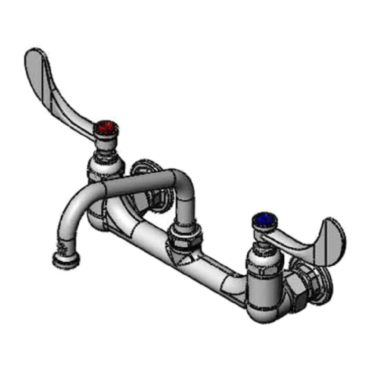 The T&S Brass B-0232-WH4 Pantry Mixing Faucet Double Wall Mount is a highly efficient fixture designed for versatile kitchen environments, featuring robust construction and precise functionality. Engineered with double-wall mounting and 8-inch centers, this faucet ensures a secure and stable installation for continuous use. The 6-inch swing nozzle offers flexibility and ease, making it suitable for various culinary tasks. Equipped with 4-inch wrist handles, this faucet allows for smooth operation even with limited hand mobility, adhering to ADA compliance standards for accessibility. Its stream regulator tip ensures a consistent and precise flow of water, enhancing user control. The integration of quarter-turn Eterna cartridges, renowned for their durability, minimizes maintenance frequency and extends the faucet's lifespan. Constructed with low-lead materials, this faucet meets safety standards for potable water use, safeguarding consumer health. The 1/2-inch NPT (National Pipe Thread) allows for seamless connectivity to existing plumbing systems, simplifying installation. Ideal for commercial kitchens or any demanding pantry setting, the T&S Brass B-0232-WH4 is a reliable solution, balancing performance and compliance with industry standards, thus catering to a range of professional kitchen requirements.