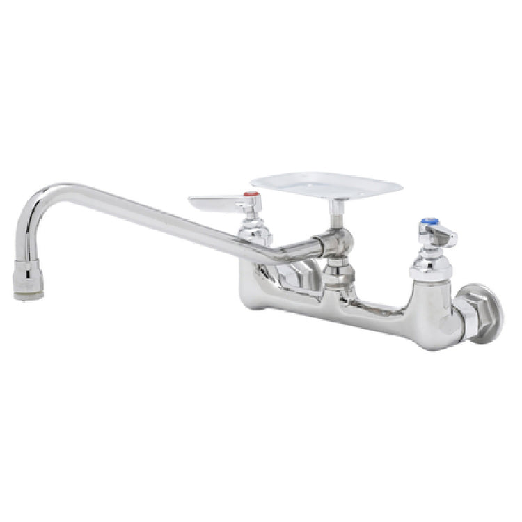 The T&S Brass B-0233-04 Sink Mixing Faucet is a wall-mounted fixture designed for both durability and functionality. This faucet features a 163 x 18-inch soap dish nozzle, providing ample space for soap storage. It is equipped with an aerator, which enhances the flow of water, ensuring a smooth and splash-free experience. The faucet operates with 8-inch centers and includes 1/2-inch IPS eccentric female inlets, making it compatible with various plumbing systems. Lever handles facilitate ease of use, and the quarter-turn Eterna cartridges provide reliable and lasting performance. Manufactured with low lead content, this faucet supports compliance with safety standards, making it suitable for use in environments where water quality matters. Furthermore, it is ADA Compliant, ensuring accessibility for individuals with disabilities, broadening its applicability across diverse market segments such as commercial kitchens, healthcare facilities, and educational institutions. This faucet is not just a utility but a significant enhancement to any setting that prioritizes both functionality and user inclusivity, meeting industry standards while offering a high degree of practicality and user convenience.