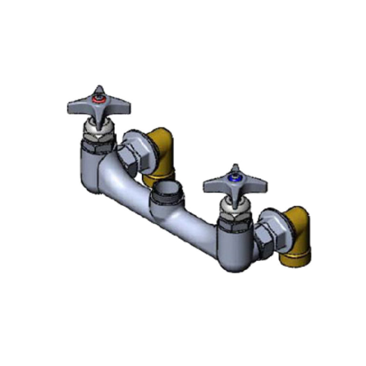 The T&S Brass B-0290-M Kettle & Pot Sink Mixing Faucet is a highly adaptable and reliable choice for commercial kitchens, offering wall-mounted installation with 8-inch adjustable centers. This model features a 12-inch Big-Flo swing nozzle with a plain end outlet, ensuring easy maneuverability and efficient water flow control. Equipped with 4-arm kitchen handles sporting color-coded indexes, this faucet allows for intuitive operation, enhancing user experience in busy kitchen environments. The inclusion of 00LL street elbows with 3/4-inch female NPT inlets adds to its versatility and compatibility with existing plumbing setups. Designed to meet ADA compliance standards, this faucet not only ensures accessibility but also reflects a commitment to inclusivity. Available in sets of six per master pack, the T&S Brass B-0290-M is a practical and valuable addition to any food service operation seeking robust and easy-to-use fixtures. Its thoughtful design and compliance with industry standards make it a preferred choice across various segments, from small-scale eateries to large-scale culinary establishments, providing a balance of quality, functionality, and adaptability.