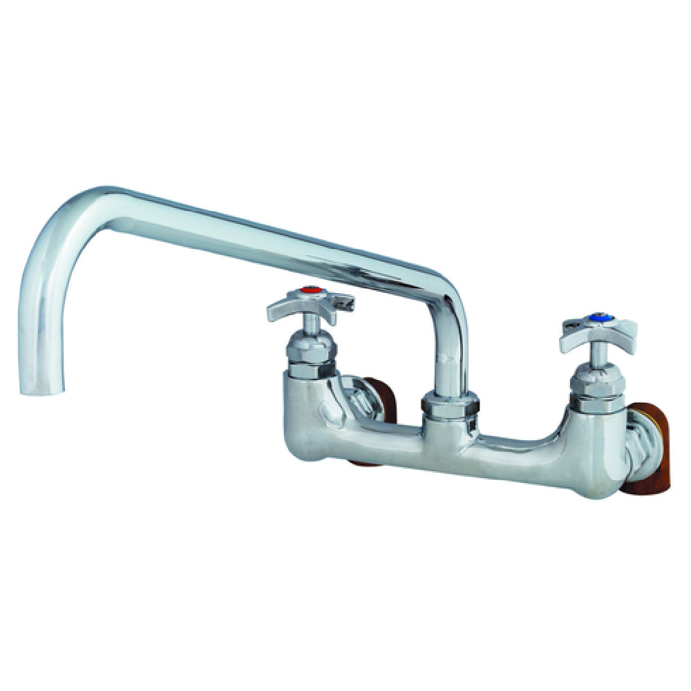 The T&S Brass B-0291 Kettle & Pot Sink Faucet Big-Flo Wall Mounted 8" Centers is a premium plumbing fixture designed for heavy-duty kitchen environments, offering substantial utility and efficiency. This faucet features wall-mounted installation with 8" centers, ensuring a robust and stable setup. It is engineered with 3/4" IPS model LL street elbow inlets complemented by secure locknuts, providing a reliable connection and enhanced performance. The 18" swing nozzle allows for comprehensive reach and versatility, accommodating a variety of pot and kettle sizes. For ease of operation, the faucet is equipped with four-arm handles that withstand temperatures up to 175°F, making it suitable for demanding culinary settings. Installation requires 1-1/4" diameter holes in the backsplash, underscoring its compatibility with commercial-grade kitchen fixtures. This product is meticulously constructed for restaurateurs, large-scale caterers, and food service professionals who demand durability and functionality in high-volume operations. Its technical specifications not only meet the rigorous standards of the industry but also deliver unmatched convenience and adaptability in professional kitchen environments.