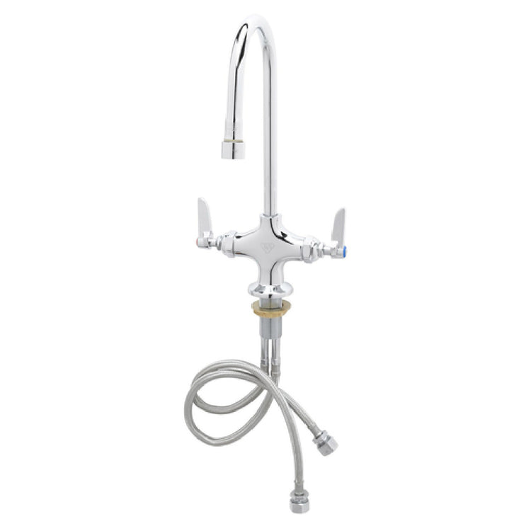 The T&S Brass B-0300-VR Double Pantry Faucet Deck Mount Single Hole Base is a precision-engineered faucet designed for professional kitchens and high-traffic areas. Featuring a 5-3/4" swivel/rigid gooseneck, this faucet accommodates both stationary and dynamic use, supported by a lock washer for secure installation. Its 2.2 gpm flow rate is managed by a vandal-resistant aerator, ensuring durability and water conservation. The faucet is equipped with quarter-turn Eterna cartridges with spring checks, enhancing reliability and ease of maintenance. Vandal-resistant lever handles with color-coded indexes improve user interaction and safety. The faucet's construction is optimized for compliance with low lead content standards, aligning with public health guidelines. Additionally, the product comes with 18" flexible stainless steel supply hoses and 1/2" NPSM male inlets, providing versatility in installation. ADA compliance underscores its accessibility for all users, making it a valuable addition to diverse environments. The T&S Brass B-0300-VR is crafted to meet the demands of both commercial and institutional settings, offering robust performance while adhering to stringent quality standards.