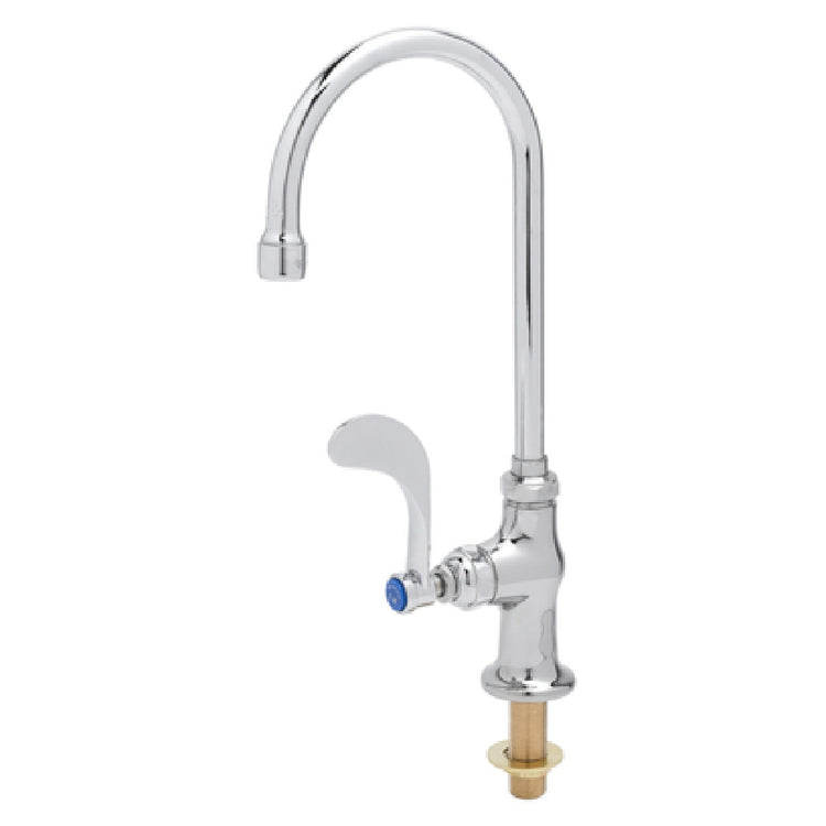 The T&S Brass B-0308-04 Pantry Faucet is a single-deck mount faucet meticulously designed for functionality and compliance with industry standards, making it a perfect fit for commercial kitchens and food service establishments. This model features a swivel gooseneck, allowing for flexible water direction, ideal for washing and rinsing tasks in busy environments. The non-splash aerator is an important component, ensuring a smooth stream of water, reducing splatter, and promoting cleanliness in high-usage settings. Equipped with a wrist blade handle, this faucet is designed for ease of use, particularly beneficial in ensuring accessibility for all users, in line with ADA compliance. The quarter-turn Eterna cartridge provides durability and long-lasting performance, facilitating efficient operation while minimizing maintenance requirements. Notably, this product is engineered to be low lead, ensuring safety and adherence to regulatory standards. The T&S Brass B-0308-04 Pantry Faucet is a reliable, compliant, and adaptable solution for various commercial water use scenarios, supporting both functionality and safety in professional kitchen environments.