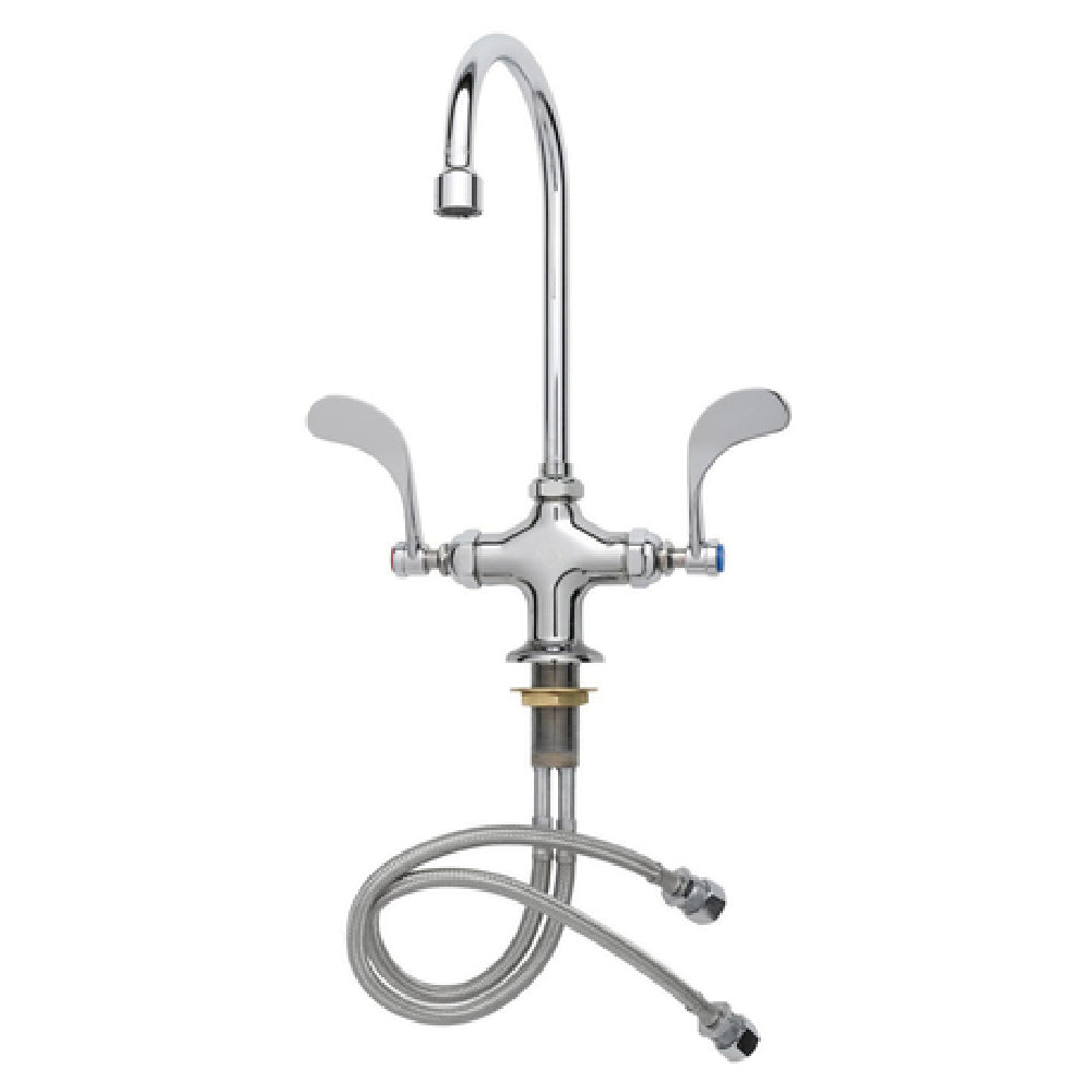 The T&S Brass B-0317 Faucet Single Single Hole is an exceptional fixture designed for both functionality and accessibility in various settings, making it a valuable addition to commercial kitchens and bathrooms. This faucet features a single-hole installation with a swivel deck mount spreader, providing flexibility and ease of use in confined spaces. Equipped with 4-inch wrist handles, the B-0317 ensures effortless operation, making it particularly suitable for environments that comply with ADA standards. The faucet boasts a 2.2 GPM aerator, delivering optimal water flow while maintaining efficiency. It incorporates quarter-turn Eterna cartridges known for their durability and reliability, ensuring long-lasting performance. Constructed to meet low lead requirements, this faucet is a safe and environmentally conscious choice. The combination of its robust design and compliance with industry standards makes the T&S Brass B-0317 Faucet a preferred choice for professionals seeking a reliable and accessible water fixture solution.