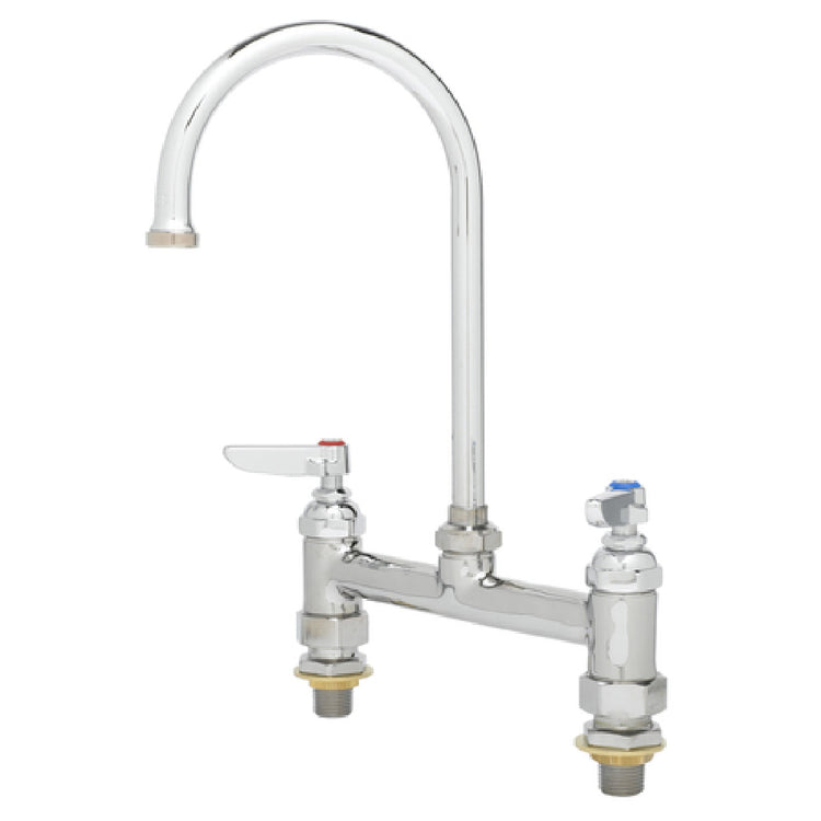 The T&S Brass B-0321-CC Mixing Faucet Deck Mount with Swivel Gooseneck is a precision-engineered fixture tailored for versatile applications in various industry segments. This faucet stands 11-3/4 inches from the deck to the top of its rigid gooseneck, providing ample clearance for diverse tasks. The gooseneck design, combined with a 7-3/4 inch distance from the nozzle tip to the deck, ensures optimal reach and functionality. Designed for an 8-inch center deck installation, this faucet includes a 6-inch spread, facilitating a stable and secure mount. Featuring 1/2-inch IPS CC male inlets, it is compatible with standard plumbing connections. The faucet is equipped with quarter-turn Eterna cartridges, renowned for their durability and smooth operation, enhancing user experience. Lever handles provide ease of use and accessibility, compliant with ADA standards. The low-lead construction of the B-0321-CC reflects a commitment to safety and environmental standards, making it suitable for eco-conscious markets. This faucet's blend of robust features and compliance with stringent standards makes it an excellent choice for professional kitchens, laboratories, and other demanding environments seeking reliability and efficiency in their plumbing fixtures.