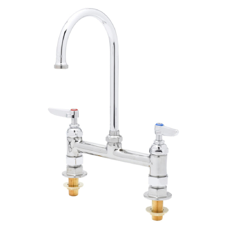 The T&S Brass B-0321-NPL Double Pantry Faucet Deck Mount 8" C/c is a highly functional and versatile faucet designed for commercial use, offering a unique blend of durability and compliance. This deck-mounted faucet features an 8-inch center-to-center configuration, making it suitable for a variety of kitchen and pantry settings. Its swivel gooseneck provides flexibility in directing water flow, accommodating a range of tasks with ease. The faucet is equipped with lever handles that ensure smooth operation and precise control over water temperature and flow. Notably, it includes B-0425 supply lines, enhancing its utility and convenience in professional environments. The incorporation of quarter-turn Eterna cartridges ensures longevity and reliability, minimizing maintenance needs. Furthermore, this faucet is low lead compliant, adhering to safety standards which makes it suitable for use in environments where health and safety are paramount. It is also ADA compliant, ensuring accessibility and ease of use for individuals with disabilities. The T&S Brass B-0321-NPL is a well-engineered solution for commercial kitchens, providing essential features and compliance benefits that cater to the diverse requirements of various industry segments.