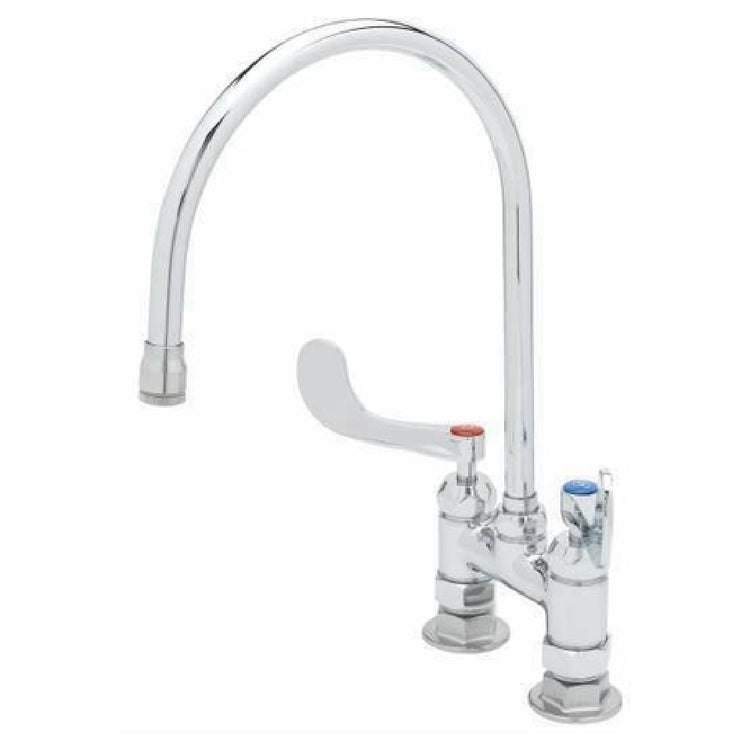 The T&S Brass B-0325-134X-CR4 Pantry Faucet is a high-quality double deck mount faucet, designed with precision for commercial and institutional settings. Featuring 4-inch adjustable centers, this faucet provides flexibility in installation. It includes a 7-3/4-inch swivel gooseneck spout with a Series 2 stream regulator outlet, which comes with a lock washer to allow conversion to a rigid setup. Its 4-inch wrist action handles are equipped with color-coded indexes for easy identification and operation. The faucet incorporates quarter-turn Cerama cartridges with check valves, ensuring a durable and reliable performance. Constructed with a polished chrome-plated body, the T&S Brass Pantry Faucet is both aesthetically pleasing and resistant to corrosion. The 1/2-inch NPT female inlets facilitate a straightforward connection to existing plumbing systems. Additionally, this model is low lead compliant and carries the cCSAus certification, attesting to its adherence to industry standards. It is also ADA compliant, making it accessible for use by individuals with disabilities. This faucet is an excellent choice for professionals seeking efficiency and longevity in high-demand environments.