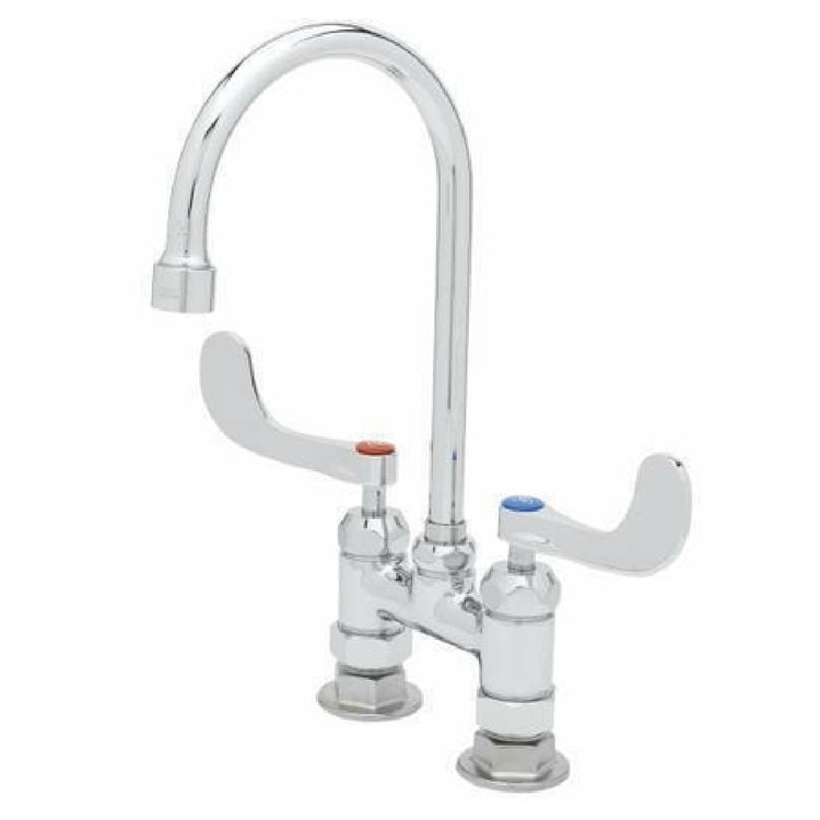 The T&S Brass B-0325-CR-WH4 Pantry Faucet Double Deck Mount is a meticulously engineered fixture designed to meet the demands of various industrial and commercial environments. This faucet features a double deck mount with 4-inch adjustable centers, allowing for flexible installation configurations tailored to diverse setups. Equipped with a 5-3/4-inch swivel gooseneck spout, it incorporates a Series 1 stream regulator outlet, which includes a lock washer for optional conversion to a rigid setup. The faucet is distinguished by its 4-inch wrist action handles, facilitating ease of use and accessibility, particularly in compliance with ADA standards. The quarter-turn Cerama cartridges with integrated check valves are pivotal in ensuring smooth operation and longevity, minimizing maintenance needs. Crafted from polished chrome plated brass, the body of the faucet not only enhances durability but also adds a sleek, modern aesthetic to any space. With 1/2-inch NPT female inlets, this faucet is versatile in terms of connectivity while adhering to low lead requirements, ensuring safety and compliance with cCSAus standards. The T&S Brass B-0325-CR-WH4 is an exemplary choice for establishments prioritizing high performance, durability, and regulatory compliance in their plumbing fixtures.