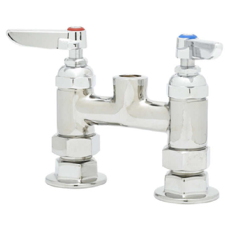 The T&S Brass B-0325-LNCC Pantry Faucet Double Deck Mount is engineered for those seeking a reliable and compliant solution in commercial kitchen environments. This robust faucet features a double deck mount design with 4-inch centers, tailored for seamless integration into a variety of kitchen layouts. Notably, it comes without a nozzle, providing users the flexibility to choose an appropriate spout based on specific needs. Equipped with a swivel spout outlet, this faucet includes a lock washer for conversion to a rigid installation if desired. The faucet’s polished chrome plated brass body not only enhances durability but also adds a sleek finish that withstands the demands of busy kitchens. The lever handles, complete with color-coded indexes, ensure ease of use and intuitive operation. The inclusion of quarter-turn Eterna cartridges with spring checks ensures smooth performance and long-term reliability. Additionally, the 1/2-inch NPT male inlets facilitate straightforward installation. Importantly, this faucet is low lead compliant, adhering to cCSAus standards, and meets ADA requirements, making it a versatile choice for establishments prioritizing safety and inclusivity. The T&S Brass B-0325-LNCC is ideal for professionals in the food service industry seeking a faucet that combines adaptability, compliance, and enduring quality.