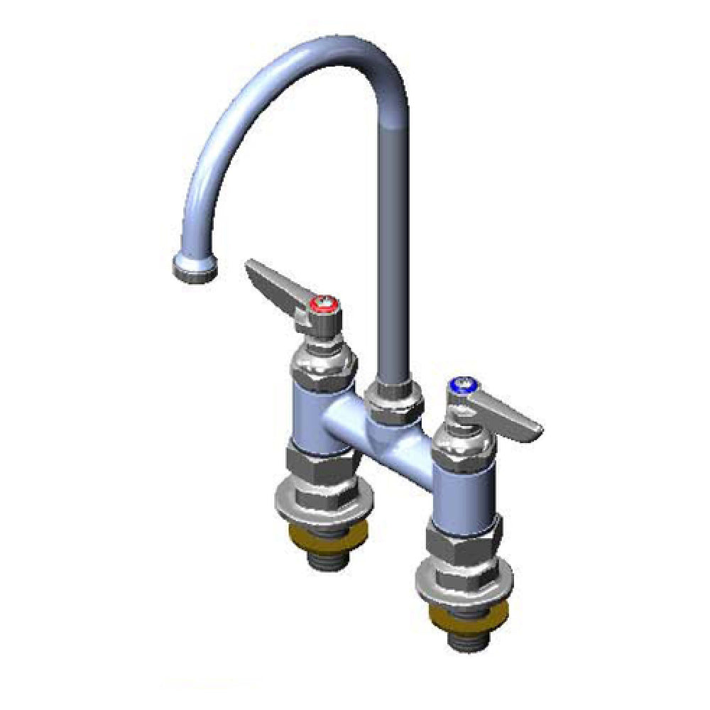 The T&S Brass B-0325-NPL Mixing Faucet is a versatile and robust plumbing solution designed for commercial and industrial kitchens. This deck-mounted unit features a 4-inch adjustable center, allowing for flexible installation across various setups. The faucet boasts a 5-3/4-inch swivel gooseneck equipped with a Series 1 stream regulator outlet, ensuring efficient water flow management. For added stability, it includes a lock washer to convert the gooseneck to a rigid setup. The faucet is built with quarter turn Eterna cartridges that incorporate spring checks, providing durability and reducing backflow. Lever handles with color-coded indexes enhance usability by clearly indicating hot and cold water. This model comes complete with a 1/2-inch NPT male nipple supply kit (B-0425), ensuring a comprehensive installation package. Constructed from polished chrome-plated brass, this faucet not only offers a sleek appearance but also guarantees longevity in demanding environments. With 1/2-inch NPT female inlets, the T&S Brass B-0325-NPL is CSA and ADA compliant, making it a reliable choice that adheres to stringent health and accessibility standards. This faucet is especially well-suited for commercial kitchens seeking a combination of functionality, durability, and compliance with industry regulations.