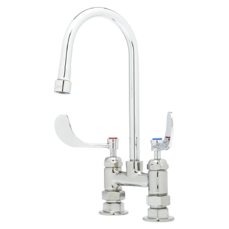 The T&S Brass B-0328 Bar Faucet is a deck-mounted unit with a 4-inch center-to-center installation, designed to meet the diverse needs of commercial and professional bar environments. This faucet features a 2.2 GPM aerator, which ensures a steady and efficient water flow rate, making it suitable for high-demand settings. Equipped with quarter-turn Eterna cartridges, it provides durability and ease of use, allowing for precise control over water temperature and flow. The lever handles are designed for ergonomic operation, enhancing user comfort and accessibility. Notably, this faucet is low lead compliant, meeting stringent safety standards for potable water applications. Furthermore, it adheres to ADA compliance requirements, ensuring accessibility for individuals with disabilities. The T&S Brass B-0328 Bar Faucet is an excellent choice for establishments seeking reliability and compliance with health and safety norms, positioning itself as a versatile solution for bars, restaurants, and hospitality venues that prioritize quality and performance in their fixtures.
