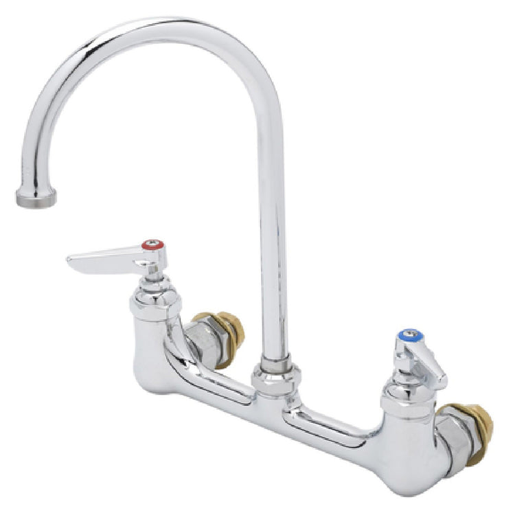 The T&S Brass B-0331-CC Faucet Wall Mount 8" Adjustable Centers is a high-quality fixture designed for diverse industrial applications, offering both functionality and compliance. Featuring 8-inch adjustable centers, this wall-mounted faucet provides flexibility in installation, making it suitable for various professional settings. The 5-3/4" swivel gooseneck, equipped with a lock washer for secure rigid applications, enhances its versatility by allowing precise water direction. Built with quarter-turn Eterna compression cartridges and spring checks, the faucet ensures durability and reliability, minimizing maintenance needs over time. The lever handles are designed with color-coded indexes for easy identification and operation. Constructed from polished chrome-plated brass, the faucet body not only adds a sleek aesthetic but also guarantees longevity and resistance to corrosion. The 1/2" NPT female inlets facilitate straightforward plumbing connections. Additionally, the T&S Brass B-0331-CC Faucet is cCSAus-certified and ADA-compliant, affirming its adherence to safety and accessibility standards. This combination of features makes it an ideal choice for a range of environments, from commercial kitchens to healthcare facilities, where both performance and compliance are paramount.