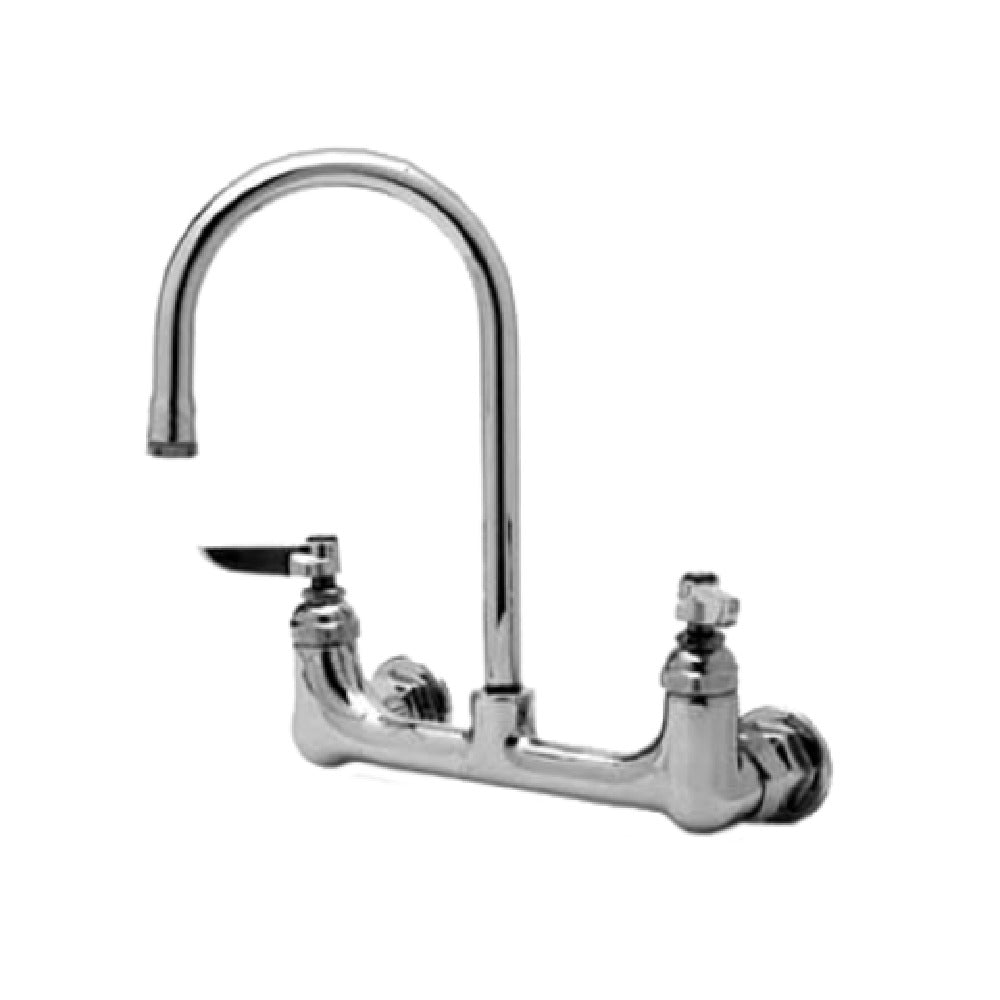 The T&S Brass B-0331-M Faucet Wall Mount 8" Adjustable Centers is a high-quality plumbing fixture designed for versatile applications, suitable for a variety of industrial and commercial settings. This faucet features 8-inch adjustable centers, providing flexibility in installation to accommodate diverse plumbing requirements. It includes a 6-inch swivel gooseneck, equipped with a lock washer for rigid applications, ensuring both adaptability and stability in use. The faucet is constructed with polished chrome-plated brass, offering durability and a sleek, professional appearance. It is engineered with quarter-turn Eterna compression cartridges that incorporate spring checks, enhancing the faucet’s longevity and performance. The lever handles are designed with color-coded indexes for easy identification and operation, promoting user convenience and compliance with accessibility standards. With 1/2" NPT female inlets, it integrates seamlessly with standard plumbing systems. This model is cCSAus certified and ADA compliant, reflecting its adherence to rigorous safety and accessibility criteria. The T&S Brass B-0331-M replaces the previous B-0330-M model and is packaged six per master pack, catering to bulk purchase requirements for large-scale operations in the hospitality, healthcare, and food service industries.