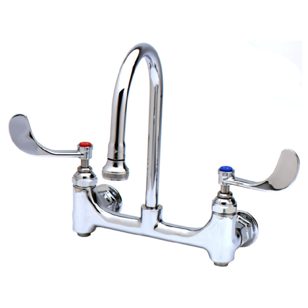 The T&S Brass B-0353-04 Medical Faucet is a highly specialized wall-mounted fixture designed to meet the demanding needs of healthcare environments. This faucet is engineered with 8" centers, providing robust stability and ease of installation. It features a 5-3/4" swivel gooseneck, allowing for versatile water flow directionality, which is crucial in medical settings where flexibility and accessibility are key. The faucet is equipped with 4" wrist handles, facilitating user-friendly operation, particularly beneficial for environments where minimization of direct hand contact is preferred for hygiene reasons. Built-in stops are included to enhance safety and control during use, ensuring efficient water management. The T&S Brass B-0353-04 utilizes 1/2" NPT connections and Eterna cartridges, known for their durability and long-term reliability, making it a cost-effective choice for medical facilities. This faucet is constructed to comply with low lead requirements, addressing environmental and health concerns. Moreover, it adheres to ADA compliance, ensuring accessibility for individuals with disabilities. The T&S Brass B-0353-04 Medical Faucet stands out in the industry as a versatile solution that balances functionality, compliance, and sustainability, making it an ideal choice for hospitals, clinics, and other healthcare-related institutions requiring reliable and accessible water dispensing solutions.