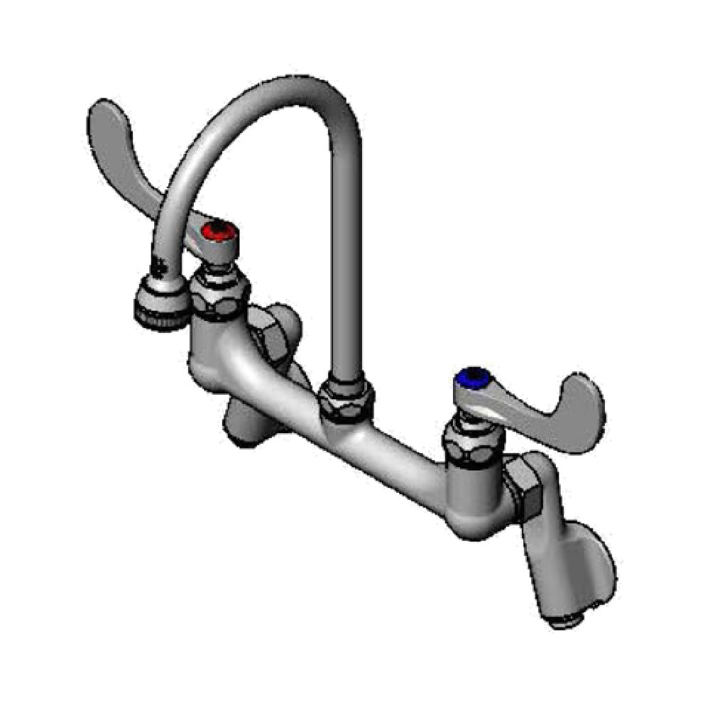 The T&S Brass B-0355-04 Surgical Sink Mixing Faucet is a highly specialized wall-mounted unit designed for precise applications requiring strict standards of hygiene and reliability. Featuring 8-inch adjustable centers, this faucet is built to adapt seamlessly to various installation settings. It incorporates quarter-turn Eterna cartridges equipped with spring checks, ensuring consistent performance and preventing backflow. The faucet is fitted with 4-inch wrist action handles, which are ergonomically designed for ease of use and come with color-coded indexes for intuitive operation. Its 5-3/4 inch swivel/rigid gooseneck is complemented by a (B-0103-01) rosespray outlet, offering flexibility and efficiency in water flow management. The inclusion of a lock washer facilitates a robust and secure rigid application. Built-in service stops add to its functionality, simplifying maintenance tasks. Crafted from polished chrome-plated brass, the faucet combines durability with an attractive finish. Its 1/2 inch NPT female adjustable arm inlets allow for versatile connections. Being CSA and ADA compliant, this unit meets critical regulatory standards, making it suitable for medical and laboratory environments where precision and safety are paramount.