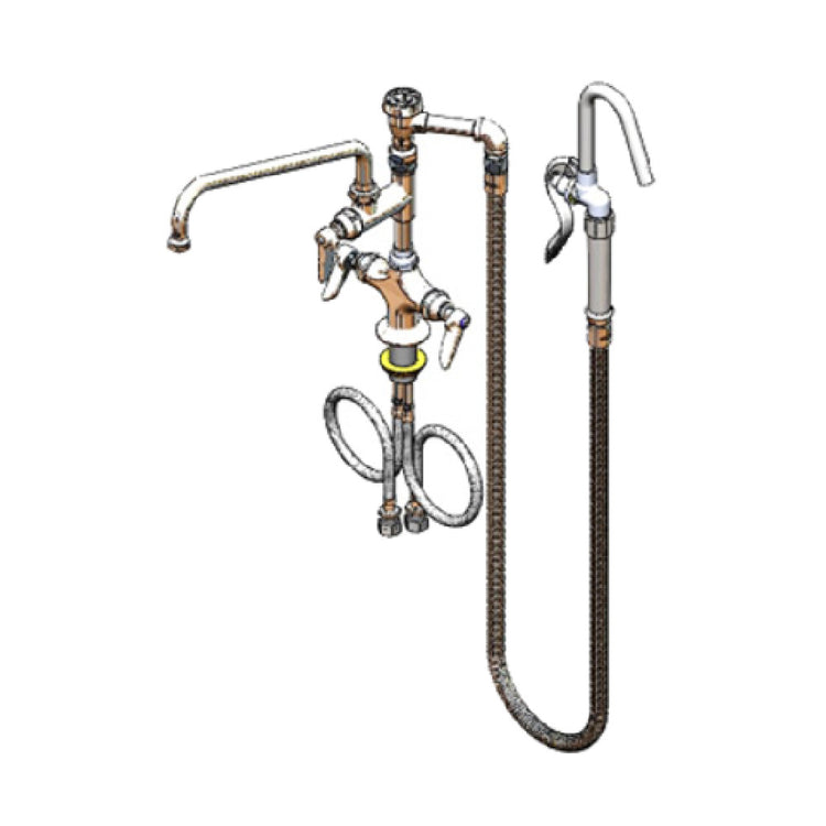 The T&S Brass B-0602 Mixing Faucet is a robust deck mount solution, ideal for various commercial and industrial applications requiring reliable water control. This faucet features a single-hole design, facilitating streamlined installation and integration into existing setups. The add-on-faucet capability enhances its versatility, catering to diverse operational needs. A standout feature of this model is the 12-inch VB swing nozzle, offering extended reach and flexibility for users. Complementing this is a durable 60-inch hose, designed to deliver water efficiently across a substantial distance, making it suitable for larger workspaces or specific tasks requiring mobility. The inclusion of a hook and nozzle ensures a secure and convenient storage solution, reducing clutter and enhancing workspace organization. T&S Brass, renowned for its high-quality plumbing products, ensures that this mixing faucet delivers on performance and durability, making it an invaluable asset for sectors such as foodservice, healthcare, and industrial operations where precise water management is crucial. This mixing faucet's thoughtful design and practical features make it a reliable choice for professionals seeking efficiency, adaptability, and long-lasting service in their facilities.