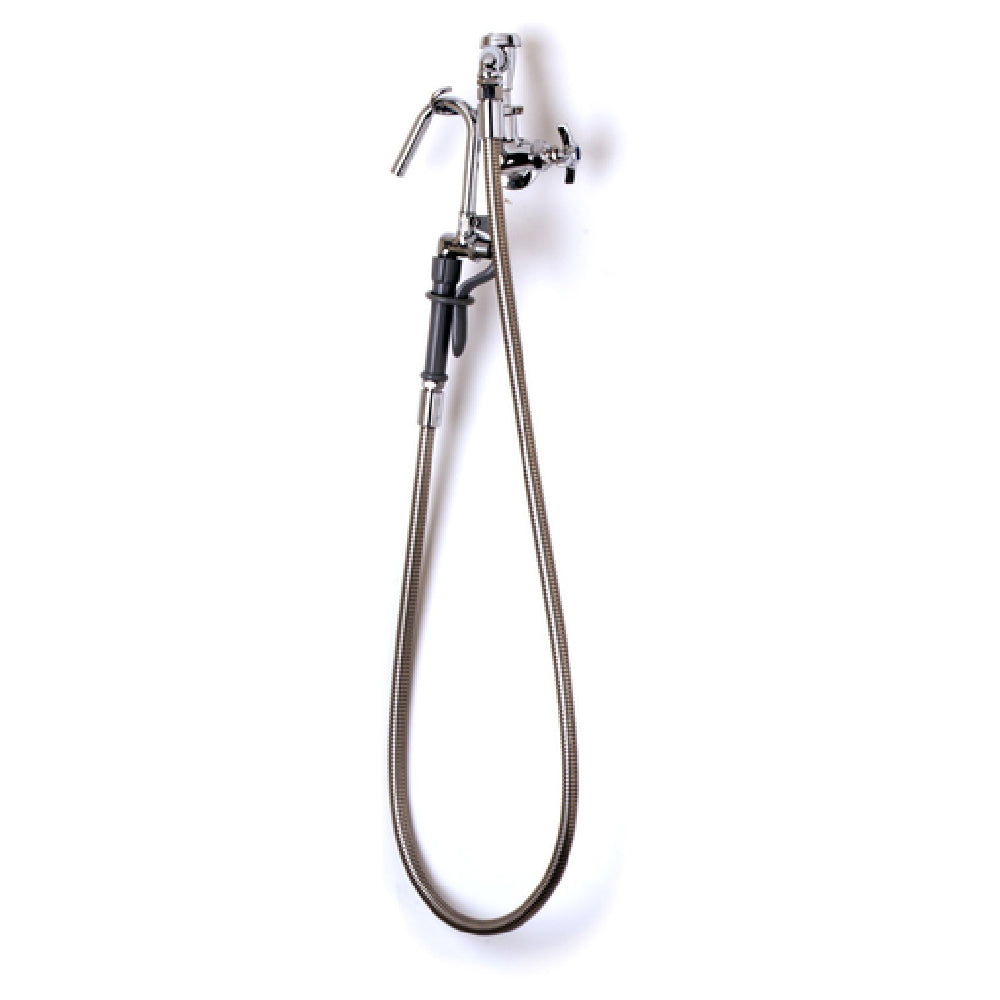 The T&S Brass B-0605-CR Pot & Kettle Filler Faucet is a wall-mounted unit featuring a sleek single-hole design, making it a suitable choice for various culinary environments. With a robust 4-arm handle, this faucet ensures ease of use and precise control over water flow. It incorporates a durable ceramic cartridge, enhancing its longevity and performance. The integrated vacuum breaker is a noteworthy component, preventing backflow and maintaining water purity. This model is equipped with a 68-inch stainless steel hose, providing ample reach and flexibility, while the self-closing hook minimizes water wastage, adding to its efficiency. Classified as a low-lead fixture, it aligns with stringent safety standards, ensuring compliance with health regulations. The inclusion of a 1/2-inch NPT connection facilitates seamless integration into existing plumbing systems. Additionally, the NSF certification underscores its adherence to public health requirements, making it an ideal fixture for professional kitchens in need of reliable and high-quality water dispensing solutions. The T&S Brass B-0605-CR offers a combination of essential features tailored to meet the demands of diverse industrial segments, from bustling restaurant environments to specialized culinary establishments. Its thoughtful construction and premium materials make it a valuable asset to any professional kitchen setup.