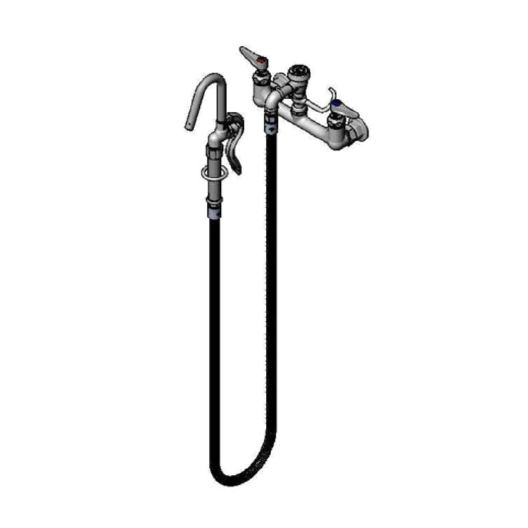 The T&S Brass B-0612 Pot & Kettle Filler Faucet is engineered for precision and reliability, featuring a wall mount mixing faucet with 8-inch adjustable centers. This faucet utilizes quarter-turn Cerama cartridges coupled with check valves, ensuring smooth operation and durability. The lever handles are equipped with color-coded indexes for easy identification and use. A standout feature is the 3/8-inch NPT EasyInstall atmospheric vacuum breaker (B-0968), which enhances safety and compliance. The faucet includes a 68-inch flexible stainless steel hose paired with a heat-resistant gray handle and hold-down ring, allowing for superior reach and usability. The hook nozzle is designed with a self-closing valve and a finger hook for added convenience. Constructed with polished chrome-plated brass, the faucet body offers both aesthetic appeal and longevity. Its 1/2-inch NPT female inlets ensure compatibility with a variety of plumbing systems. Ideal for use in commercial kitchens, cafeterias, and other professional food service environments, this faucet meets the Canadian Standards Association (CSA) criteria, underscoring its quality and safety. The T&S Brass B-0612 Pot & Kettle Filler Faucet is a versatile and essential tool, providing excellent functionality for tasks that require a reliable water supply.