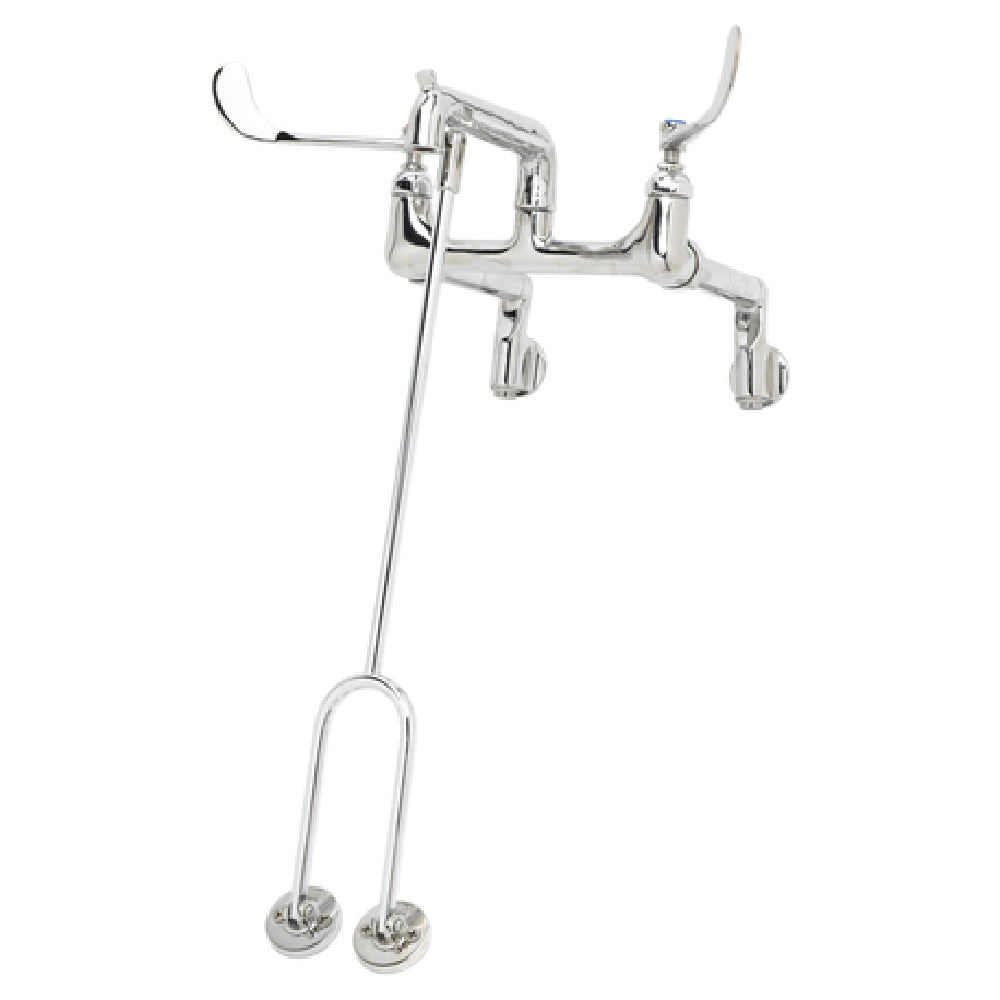 The T&S Brass B-0650-02 Service Sink Faucet is a precisely engineered fixture designed for durability and performance in demanding environments. With a configuration of 8-inch centers, it allows for easy alignment and installation in compatible settings. The faucet is designed with a 5-1/4-inch clearance from the wall to the center line, ensuring a balanced and space-efficient integration. Additionally, it extends 15-3/4 inches from the wall to the center of the outlet, offering ample reach for various service applications. The faucet features 6-inch wrist action handles, providing ergonomic ease of use and enhancing operability for users. For added stability, the faucet includes a bottom support wall brace, ensuring robust support and reducing strain on the installation point. The polished chrome-plated finish not only offers a sleek aesthetic appeal but also provides enhanced resistance to wear and corrosion. Integral stops further contribute to the faucet’s reliability, allowing for easy maintenance and control over water flow. This combination of features makes the T&S Brass B-0650-02 Service Sink Faucet a versatile solution for commercial settings such as hospitals, schools, and maintenance facilities, where durable and efficient water delivery systems are a necessity.