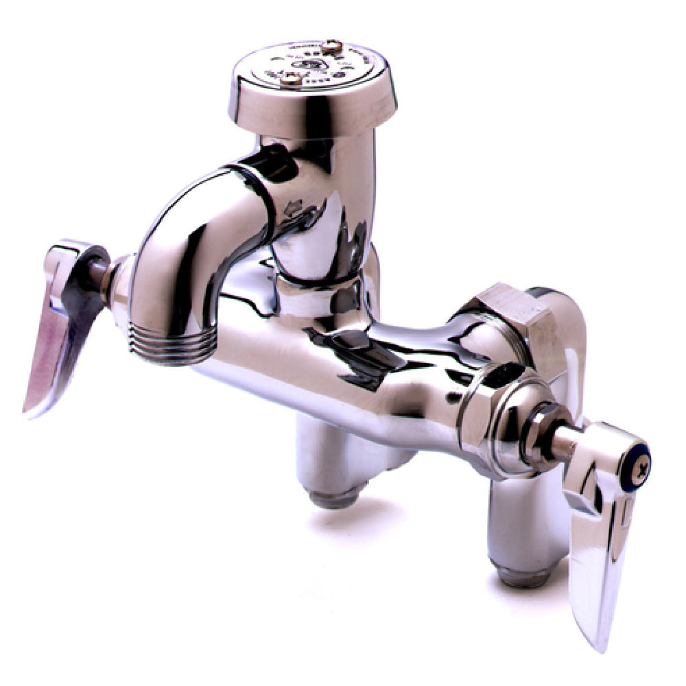 The T&S Brass B-0670-POL Service Sink Faucet is a highly adaptable fixture designed for various industrial and commercial applications, providing optimal functionality and reliability. It features adjustable centers ranging from 2-1/4" to 8-1/4", allowing for versatility in installation across different settings. This faucet extends 5-1/2" from the back of the inlets to the center of the outlet, ensuring it fits comfortably in diverse sink configurations. Its polished chrome-plated finish not only enhances durability but also adds a sleek, professional appearance suitable for high-traffic environments. A distinctive feature of the T&S Brass B-0670-POL is its vacuum breaker nozzle equipped with a 3/4" garden hose thread and pail hook, making it particularly useful for maintenance and cleaning tasks in service areas. Additionally, the absence of integral stops in the adjustable inlets means it offers a streamlined design for straightforward maintenance and ease of use. This faucet is an excellent choice for professionals in plumbing, facility management, and maintenance sectors who require a dependable, flexible solution tailored to the rigorous demands of service sinks.