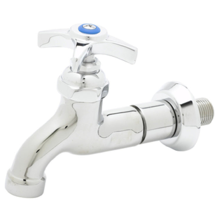 The T&S Brass B-0718 Single Sink Faucet - a durable and heavy-duty fixture engineered for robust performance - is tailored for various industry applications requiring a competent water management solution. Its construction features a 1/2" IPS male inlet, ensuring compatibility with numerous plumbing setups, and an adjustable flange for adaptable installation. The faucet extends from a 6" inlet to the center of the outlet, allowing optimal water flow control and spatial efficiency. Its four-arm handle facilitates smooth operation, while the 3/4" hose thread outlet accommodates additional attachments, enhancing its functionality. This unit is available in both "C" (cold) and "H" (hot) configurations, providing flexibility to meet diverse operational needs. The T&S Brass B-0718 is an ideal choice for settings ranging from commercial kitchens to industrial environments, promising reliability and precision in water delivery management. Its sturdy build and practical design underscore its suitability for demanding conditions, making it a preferred choice for professionals seeking efficient and reliable plumbing solutions. The T&S Brass B-0718 exemplifies meticulous craftsmanship, ensuring it withstands rigorous usage while maintaining optimal performance. This faucet is a testament to T&S Brass’s commitment to quality and innovation in plumbing fixtures.