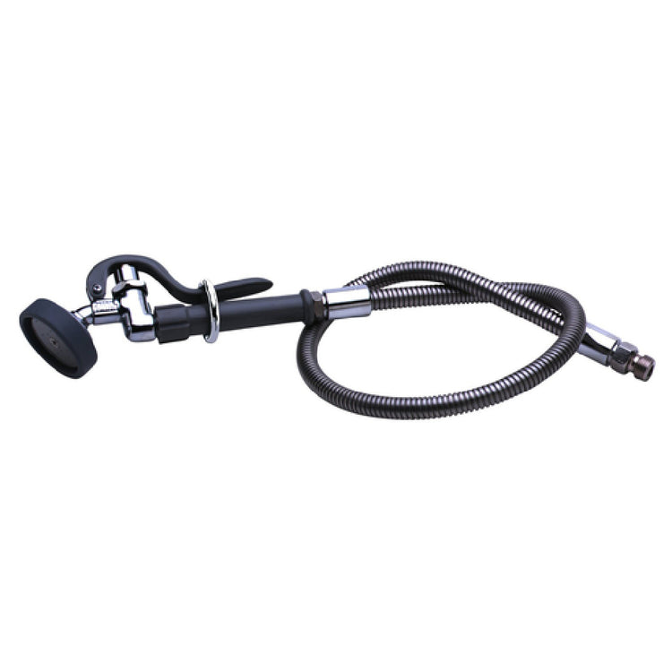 The T&S Brass B-0955 Pre-Rinse Spray is meticulously crafted for efficiency and durability, featuring the B-0107 automatic shut-off valve paired with a high-performance spray head. This model integrates the B-0044-R Dura strong reinforced PVC hose, ensuring robust and long-lasting use, suitable for demanding kitchen environments. With a 1/2" IPS male inlet, it seamlessly connects to various plumbing systems, offering versatility across different market segments within the food service industry. The unit boasts an overall length of 48 inches, providing ample reach and flexibility for thorough cleaning tasks. This comprehensive pre-rinse spray assembly is engineered to meet the rigorous standards of professional kitchens, enhancing operational efficiency with its automatic shut-off capabilities and dependable construction. The T&S Brass B-0955 is a reliable asset for restaurants, catering services, and industrial kitchens, delivering exceptional performance and value through its detailed and practical design. By incorporating durable materials and advanced engineering, this product stands out as a quintessential tool for ensuring cleanliness and efficiency in high-traffic culinary settings.