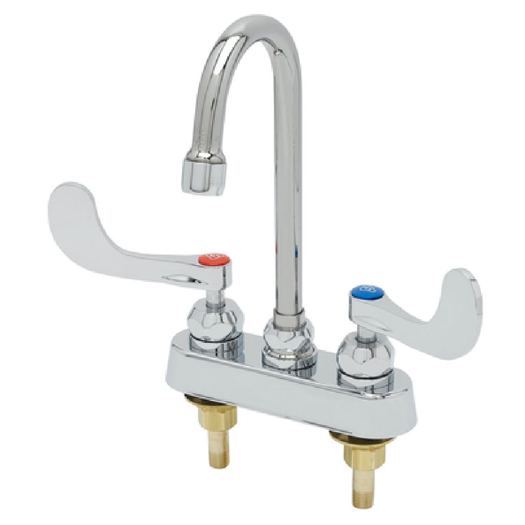 The T&S Brass B-1110-187XWSC4 Workboard Mixing Faucet is a high-performance fixture designed to meet the needs of various commercial environments. This deck-mounted faucet features a 4-inch deck mount, offering stability and ease of installation. Its swivel gooseneck enhances flexibility and functionality, allowing for a 360-degree range of motion which is ideal for tasks that require a wide reach. The faucet stands at 9-3/4 inches high, providing ample space beneath for various applications. With a 3-5/8-inch spread, it fits well into compact spaces without compromising on performance. Equipped with 4-inch wrist action handles, it ensures ease of use, especially in settings that prioritize accessibility. The quarter-turn ceramic cartridges with check valves contribute to its durability and leak-proof operation, making it a reliable choice for long-term use. This faucet includes a 1.5 GPM aerator, promoting water efficiency and cost savings. Designed with low-lead content, it complies with safety standards, and its 1/2"NPT male connections ensure seamless integration into existing systems. ADA compliance highlights its commitment to accessibility, and the cCSAus certification reinforces its adherence to quality and safety standards. This versatile mixing faucet is suitable for hospitals, food service industries, and other commercial settings where hygiene and efficiency are paramount.