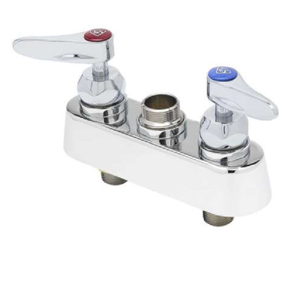 The T&S Brass B-1110-CR-LNM Workboard Faucet - Deck Mount 4" Centers is a precision-engineered fixture designed for commercial and industrial environments requiring reliable and efficient water control. This faucet stands out with its robust construction, featuring cerama cartridges that ensure longevity and smooth operation. The unit is designed for a deck mount installation with 4" centers, making it suitable for a variety of workboard setups. It comes without a nozzle, allowing for customization according to specific needs. The faucet is equipped with lever handles that feature color-coded indexes, enhancing usability by facilitating quick identification of hot and cold water controls. Constructed with polished chrome, it not only provides an appealing aesthetic but also ensures durability and resistance to corrosion. The inclusion of 1/2" male NPT connections provides compatibility with a wide range of plumbing systems. Importantly, this product adheres to low-lead requirements, making it a safer option for environments prioritizing health compliance. It is ADA Compliant, ensuring accessibility for all users, and NSF certified, underscoring its quality and safety standards. Packaged six per master pack, the T&S Brass B-1110-CR-LNM is an ideal choice for sectors including hospitality, food service, and any facility requiring a dependable water fixture.