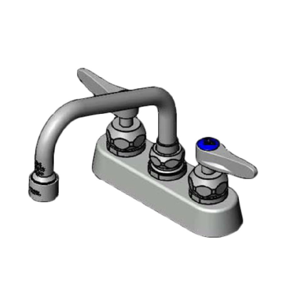 The T&S Brass B-1110-XS-V12CR Workboard Mixing Faucet is a deck-mounted fixture, purposefully designed for functionality and durability across diverse professional settings. Featuring 4-inch centers, this faucet is equipped with quarter-turn Cerama cartridges that include check valves, ensuring smooth operation and reducing maintenance needs. The chrome-plated lever handles are accented with color-coded indexes for intuitive use, providing ease of operation. The faucet boasts a 6-inch swing nozzle, offering versatility in water direction and application, while the 1.2 GPM vandal-resistant aerator ensures water conservation and security against tampering. Additionally, the faucet incorporates 1/2-inch NPSM extended male inlets and comes with tailpieces and nuts for 1/4-inch NPT male connections, promoting ease of installation. Constructed from chrome-plated brass, the faucet’s body and spout offer durability and a sleek aesthetic. It adheres to low lead compliance standards, ensuring safety and quality. Furthermore, this model meets ADA compliance, reinforcing its accessibility and usability in various environments. Certified by CSA, ASME, ANSI, and NSF, the T&S Brass B-1110-XS-V12CR Workboard Mixing Faucet is a reliable and efficient choice for industries demanding high standards of hygiene and functionality.