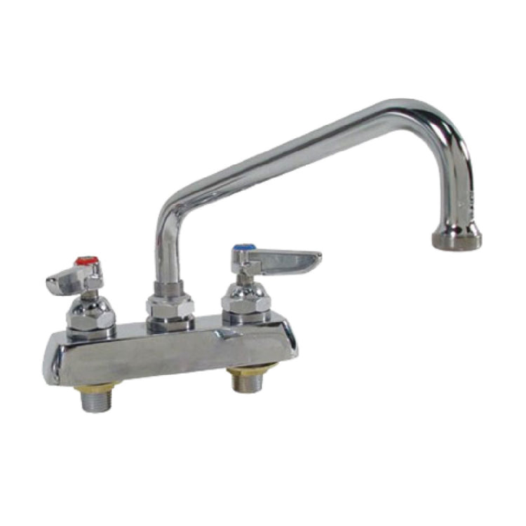 The T&S Brass B-1113-M Faucet is a highly functional and versatile plumbing fixture designed for various commercial applications. It features a sturdy 4-inch deck mount that ensures secure installation on countertops, making it ideal for environments that require reliable water dispensing solutions, such as restaurants, hospitals, and industrial kitchens. The faucet is equipped with a 12-inch swing nozzle, allowing for flexible water direction and ease of use, which is especially beneficial in tasks requiring a larger reach or multiple sink compartments. This deck-mounted faucet comes in a master pack of six units, catering to bulk purchase needs for large-scale operations. The T&S Brass B-1113-M Faucet stands out in the market for its combination of practical design and durability, ensuring long-lasting performance in demanding settings. Its construction reflects the quality and dependability T&S Brass is known for, making it a trusted choice for professionals seeking efficient water management solutions. By understanding the unique requirements of different markets within the industry, this faucet provides a tailored solution that meets the demands of high-traffic environments, promising seamless integration and operation within any commercial setup.