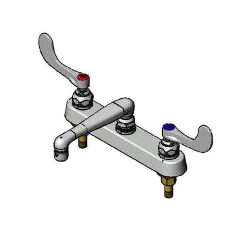 The T&S Brass B-1120-0CS6-WH4 Workboard Faucet Deck Mount with 8" centers is a precisely engineered solution for various commercial applications, offering unique value through its design and features. This faucet incorporates quarter-turn Eterna cartridges with spring checks, ensuring longevity and reliable performance. It is equipped with 4" wrist handles with color-coded indexes, providing ease of use and accessibility, aligning with ADA compliance standards. The faucet features a 6" cast spout (0CS6) and a 2.2 GPM Series 2 aerator (B-0199-02), allowing efficient water flow while maintaining water conservation efforts. Its chrome-plated brass construction enhances durability and resistance to corrosion, making it an ideal choice for high-demand environments. The unit includes tailpieces and nuts for a 1/4" NPT male connection and has 1/2" NPT male inlets, ensuring compatibility with a range of plumbing systems. The T&S Brass B-1120-0CS6-WH4 is CSA certified, confirming its adherence to safety and performance standards. This faucet is particularly suited for use in food service, healthcare, and laboratory settings where hygiene, reliability, and functionality are paramount. Its thoughtful design and robust construction make it a valuable component across various segments of the industry.