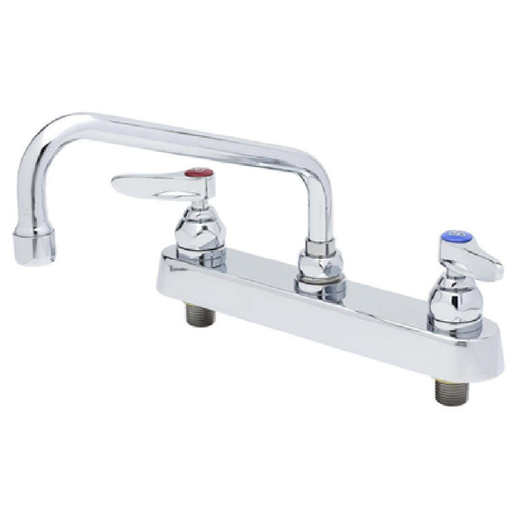 The T&S Brass B-1122 Faucet - 10" Swing Nozzle Deck Mounted is a versatile and reliable component designed for various commercial and industrial applications. This faucet is equipped with a 10-inch swing nozzle, making it ideal for tasks requiring extended reach and flexibility. Its deck-mounted design ensures easy installation and stability on countertops, catering to a variety of sink configurations. The faucet utilizes quarter-turn Eterna cartridges, known for their durability and ease of use, providing a precise and smooth operation. Lever handles offer ergonomic handling, enhancing user experience by allowing effortless control of water flow and temperature. The B-1122 model is low lead compliant, aligning with stringent safety standards, making it a suitable choice for environments prioritizing health regulations. Furthermore, it meets ADA compliance, ensuring accessibility for individuals with disabilities. The T&S Brass B-1122 Faucet is tailored for segments across the foodservice industry, educational institutions, and healthcare facilities, where reliability and compliance with safety standards are paramount. Its robust construction and thoughtful design elements ensure it stands up to daily demands, providing consistent performance and long-lasting service. This faucet perfectly balances functionality and compliance, making it an essential fixture for diverse operational needs.