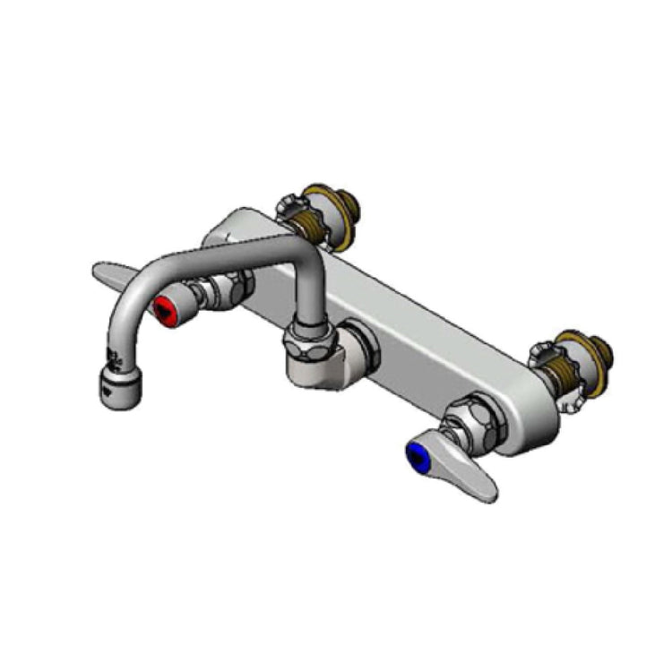 The T&S Brass B-1125-XS Faucet Workboard is a precisely engineered plumbing fixture tailored for diverse commercial environments. Featuring a 6-inch swivel spout, this faucet facilitates a versatile range of motion, making it ideal for tasks requiring flexibility and precision. The splash-mounted design ensures stability and seamless integration into various workstations. Its robust bronze body enhances durability, while the chrome-plated escutcheon, measuring 10-1/2 inches in width and 2 inches in height, adds a touch of elegance and corrosion resistance. The faucet is designed with 8-inch centers and a 1/2-inch NPT male inlet, ensuring compatibility with standard plumbing systems. It incorporates quarter-turn Eterna cartridges, renowned for their reliability and ease of use, reducing maintenance frequency and extending service life. The low lead content underscores its compliance with safety standards, while ADA compliance ensures accessibility and usability for all users. The removable seats feature allows for straightforward maintenance and adaptability to evolving needs. This faucet is a preferred choice for industries demanding high performance and reliability, such as food service, hospitality, and healthcare, where its technical specifications meet rigorous operational demands.