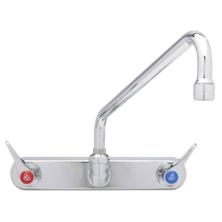 The T&S Brass B-1128 Workboard Faucet Wall Mount 8" Centers is an expertly designed plumbing fixture, ideal for commercial and industrial settings requiring robust and reliable water delivery systems. This faucet features 8-inch centers for secure wall-mount installation, ensuring stability and ease of use in various professional environments. With a 12-inch swivel/rigid spout, it provides versatility for different sink sizes and applications, catering to a range of operational needs. The faucet is equipped with a 2.2 GPM aerator, delivering efficient water flow while conserving resources. Its quarter-turn Eterna cartridges are engineered for durability and easy operation, minimizing maintenance and enhancing longevity. The lever handles offer user-friendly control, optimizing functionality in busy kitchens or workspaces. Designed with 1/2" NPT inlets, this faucet ensures a standard connection compatible with most plumbing systems. It is low lead compliant, aligning with health and safety standards, and is ADA compliant, making it accessible for all users. The T&S Brass B-1128 is a versatile solution for businesses demanding high-performance and reliable water fixtures, providing exceptional technical features that meet the diverse requirements of food service, hospitality, healthcare, and various industrial markets.