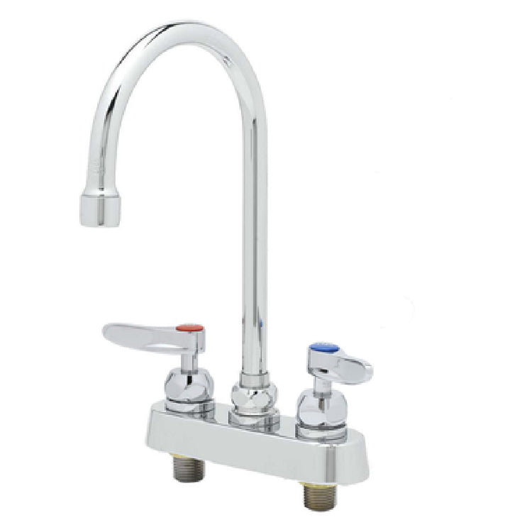 The T&S Brass B-1141-CR Faucet Workboard Swivel Deck Mount is a meticulously engineered fixture designed for commercial settings requiring reliable and efficient water management solutions. With an 11-3/8" long gooseneck spout, this faucet provides ample reach and flexibility, making it suitable for various workboard applications. Its deck mount configuration and 4" centers facilitate straightforward installation on compatible surfaces. Equipped with lever handles, the B-1141-CR ensures ease of use and precise water control. The incorporation of cerama cartridges enhances durability and longevity, reducing maintenance needs in high-use environments. This faucet includes check valves, which play a crucial role in preventing backflow, thus maintaining the integrity of water systems. A lock washer (014200-45) is supplied to secure the assembly in place. The faucet delivers a 2.2 GPM flow rate through its low-lead, polished chrome finish, balancing aesthetics with functionality while adhering to safety standards. Its 1/2" male NPT connections allow for compatibility with standard plumbing systems. The T&S Brass B-1141-CR is ADA Compliant and certified by ANSI and NSF, attesting to its adherence to accessibility and safety standards. This faucet is an ideal choice for institutions seeking a robust and compliant water fixture solution.