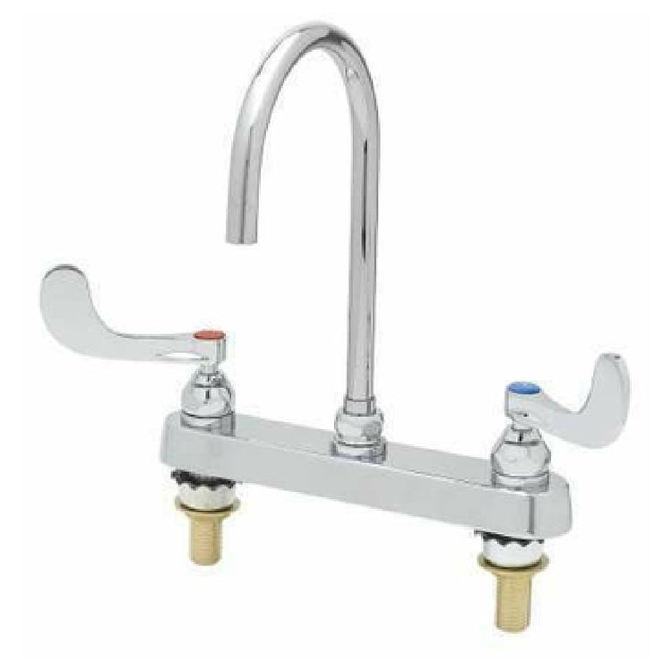 The T&S Brass B-1142-QT5XPF15 Workboard Mixing Faucet is meticulously designed for optimal performance and versatility in professional settings. This deck-mounted faucet boasts 8-inch centers, providing a stable and secure installation on any workboard. It features a 5-11/16-inch plain end swivel gooseneck nozzle, ensuring smooth and efficient water delivery, regulated at a flow rate of 1.5 GPM. The inclusion of quarter-turn Eterna cartridges with spring checks enhances its durability and ease of use, allowing for precise water flow control and reducing the risk of backflow. The faucet is equipped with 4-inch wrist action handles, distinguished by color-coded indexes for intuitive hot and cold water identification, which enhance user convenience in high-paced environments. It also includes 1/2-inch NPSM extended male inlets, facilitating seamless integration with existing plumbing systems. Notably, this faucet is low lead compliant, aligning with stringent safety standards to ensure water quality. It carries cCSAus and ADA compliance certifications, reflecting its commitment to accessibility and safety in diverse operational contexts. The T&S Brass B-1142-QT5XPF15 faucet is a reliable and efficient solution for industries requiring robust plumbing solutions, such as food service establishments, ensuring both functionality and adherence to regulatory standards.