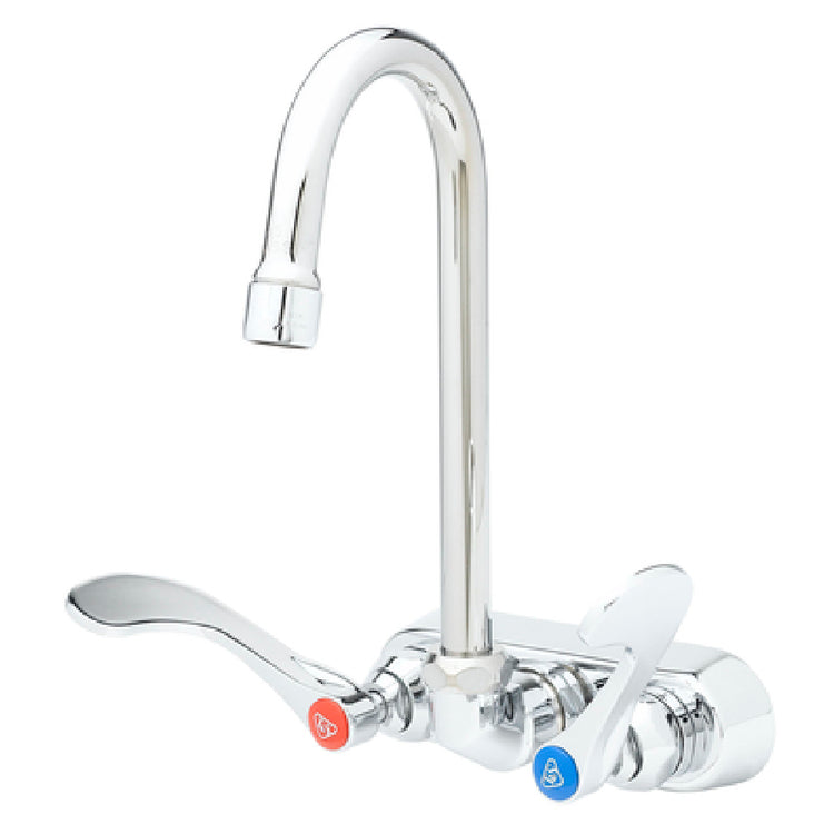 The T&S Brass B-1146-02A-CR4 Workboard Mixing Faucet 4" Wall Mount Swivel is expertly engineered for optimal performance and efficiency in various commercial settings. Featuring a 4" wall mount design, this faucet is equipped with a swivel gooseneck, allowing for flexible water direction. With a height of 9-11/16" and a 4-3/8" spread, it is designed to accommodate a range of workboard applications. The faucet includes 4" wrist action handles with color-coded indexes, ensuring ease of use and compliance with ADA standards. The integration of quarter-turn cerama cartridges with check valves provides precise water control and prevents backflow. With a flow rate of 2.2 gallons per minute, the faucet maintains efficient water usage, meeting industry needs. Its low-lead composition aligns with health standards, while the 1/2"NPT male connection ensures compatibility with existing plumbing systems. Certified by cCSAus, this T&S Brass faucet is a reliable choice for professionals seeking quality fixtures in the foodservice and hospitality sectors. Its robust design and technical specifications make it an essential component for any workspace requiring dependable water delivery solutions.