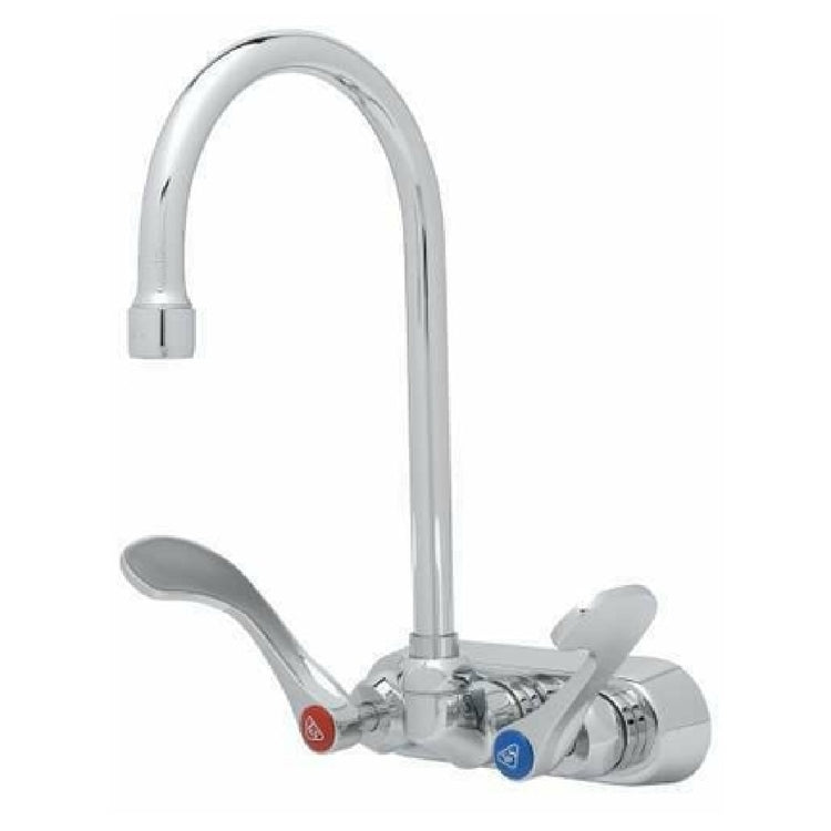 The T&S Brass B-1146-04-CR Workboard Faucet Wall Mount 4" Centers is a high-performance fixture tailored for diverse professional settings. This faucet features a 5-3/4" swivel gooseneck nozzle, which can be secured into a fixed position with the included lockwasher, providing versatility in water flow control. The unit operates at a robust 2.2 GPM, thanks to its integrated aerator, ensuring efficient water usage. A standout element is the quarter-turn Cerama cartridges, which are equipped with check valves for improved durability and leak prevention. These cartridges guarantee smooth operation and long-term reliability. The faucet is designed with 4" wrist blade handles, each marked with color-coded indexes for easy hot and cold water identification, enhancing user convenience. Its 1/2" NPT male inlets ensure secure and compatible connections. Designed to meet ADA compliance, this model supports accessibility standards, making it suitable for inclusive environments. The T&S Brass B-1146-04-CR is a versatile choice for a range of industry applications, including food service and commercial spaces, where durability and efficiency are paramount.