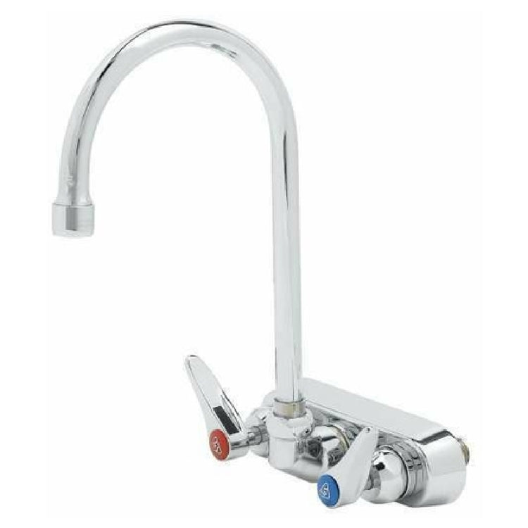 The T&S Brass B-1146-CR-WS Workboard Faucet Wall Mount 4" Centers is a meticulously engineered plumbing fixture designed for commercial settings that require reliability and efficiency. This wall-mounted faucet features a 5-3/4" swivel gooseneck nozzle, which includes a lock washer to convert the unit to a rigid configuration, providing adaptability based on specific needs. With a flow rate of 1.5 GPM, the faucet ensures water conservation without sacrificing performance. The quarter-turn Cerama cartridges are equipped with check valves, enhancing durability and preventing backflow, which is critical for maintaining water quality in professional environments. The lever handles come with color-coded indexes, facilitating effortless operation and ensuring compliance with ADA standards for accessibility. Furthermore, the faucet is fitted with 1/2" NPT male inlets, ensuring compatibility with a wide range of plumbing setups. The thoughtful design and robust construction of the T&S Brass B-1146-CR-WS make it a versatile choice for various industry segments, including restaurants, laboratories, and industrial kitchens, where precision and dependability are paramount. Its blend of functionality and compliance with industry standards underscores its value in demanding environments.