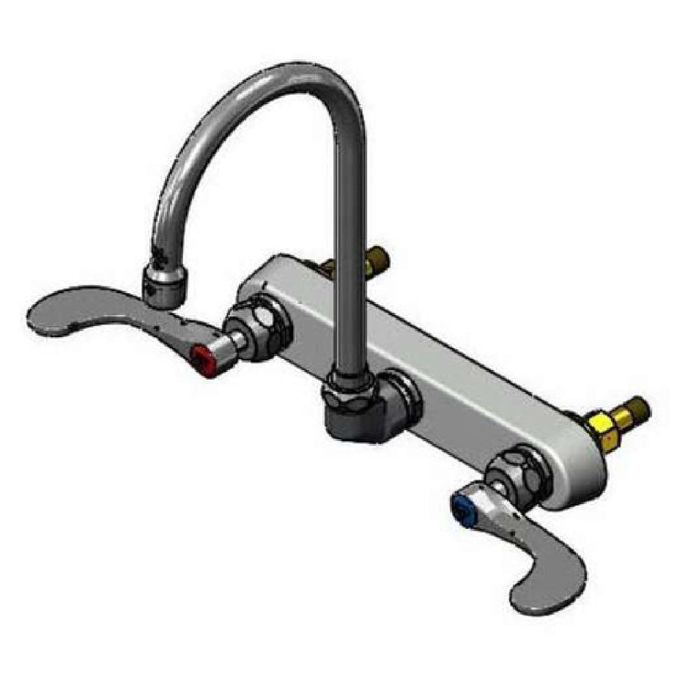 The T&S Brass B-1147-04-CR Workboard Faucet Wall Mount 8" Centers is a highly efficient plumbing fixture designed for commercial settings, providing functionality with style and precision. Engineered with 8" centers, this wall-mounted faucet is ideal for workboards, ensuring easy access and maximum space utilization. It features wrist action handles complemented with color-coded indexes, simplifying operation and enhancing user convenience. At the core of its design is a 5-3/4" swivel gooseneck spout, offering flexibility and extended reach for a variety of tasks. The faucet incorporates quarter-turn Cerama cartridges equipped with check valves, ensuring smooth operation and reducing wear over time. With a spray valve delivering a robust 2.2 gallons per minute (GPM), it efficiently handles water flow for demanding tasks. The 1/2" NPT male inlets facilitate straightforward installation, and the polished chrome finish adds a touch of elegance while ensuring durability. ADA compliance guarantees accessibility, catering to a wide range of users, while the low lead content aligns with health standards. Certified by cCSAus, this faucet is a reliable choice for environments where performance and safety are paramount, such as restaurants, schools, and healthcare facilities.