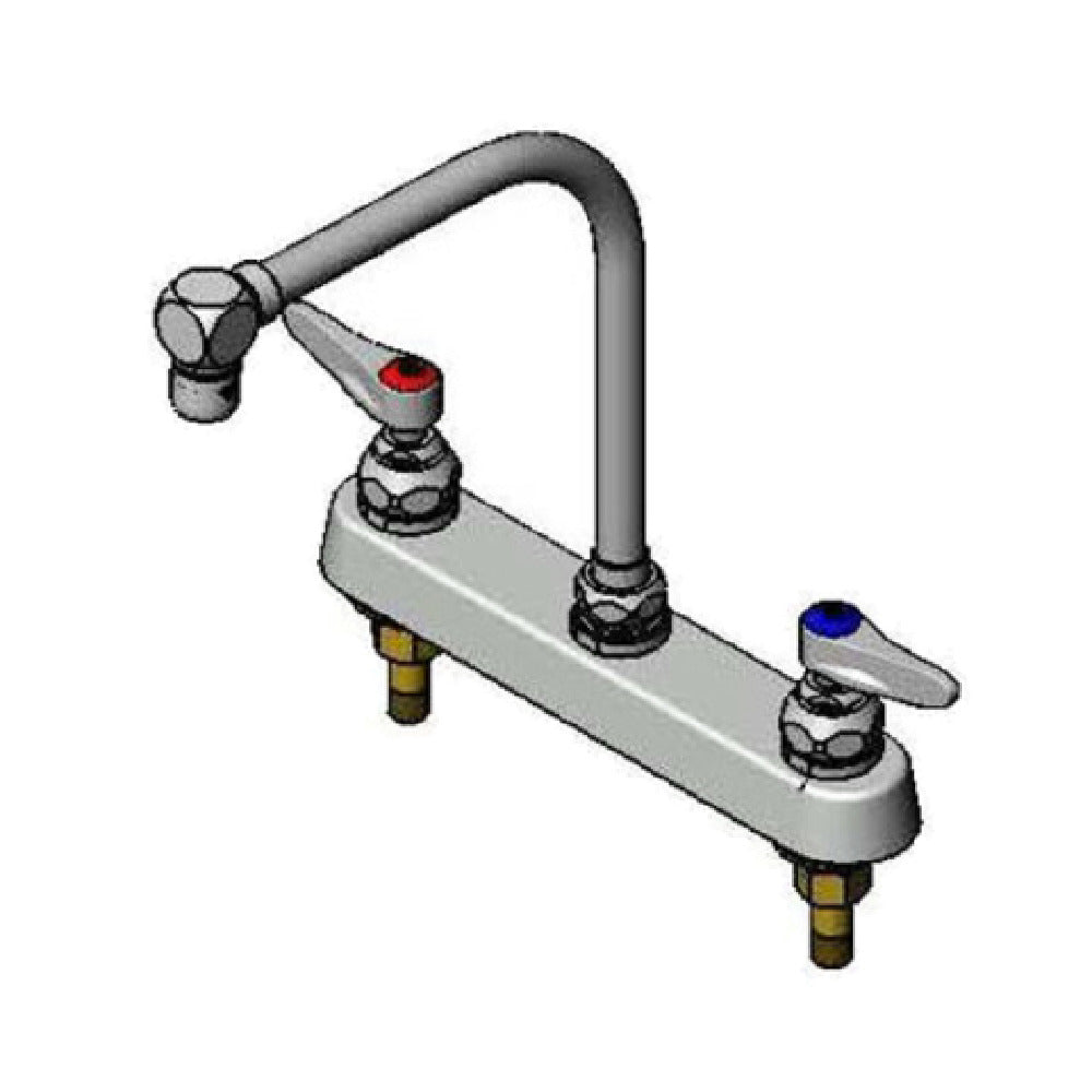 The T&S Brass B-1148 Faucet Workboard Deck Mount 8" Center is a meticulously designed faucet tailored for both commercial and residential use, boasting a robust array of features that cater to a variety of needs in the plumbing industry. This deck-mounted faucet features an 8-inch center and a swing gooseneck design, providing flexible water delivery and ease of use. Enhanced with an aerator, it ensures a smooth, splash-free water flow. The faucet is equipped with lever handles, making it user-friendly and compliant with ADA standards, ensuring accessibility for all users. The construction includes quarter-turn Eterna cartridges, renowned for their durability and long life, minimizing maintenance needs. Featuring 1/2" NPT male shanks, the faucet offers reliable connectivity for installation. Furthermore, the faucet adheres to low lead requirements, ensuring safety and compliance with health regulations. The T&S Brass B-1148 is engineered to meet the demands of diverse work environments, from industrial kitchens to residential homes, offering a combination of functionality, compliance, and durability. Its thoughtful design and compliance with ADA standards make it a versatile choice, delivering dependable performance and a commitment to safety within any setting.