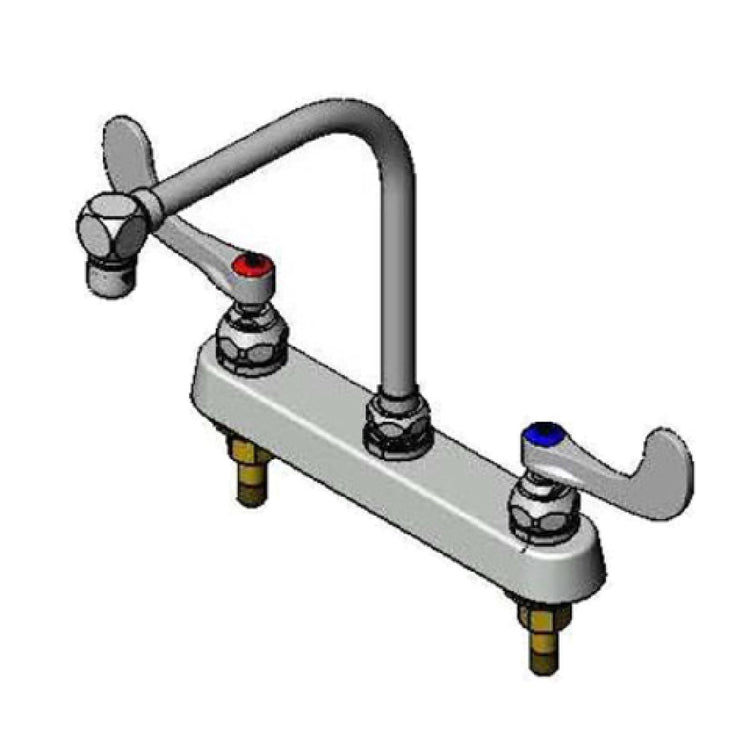The T&S Brass B-1149 Faucet Workboard is a deck-mounted unit with an 8-inch center, specifically engineered for professional and commercial environments requiring reliable plumbing solutions. Featuring a swing gooseneck spout, it provides flexibility in water direction and easy handling, essential for workspaces that demand efficiency and precision. The faucet includes an aerator, which ensures a smooth water flow while conserving water usage, thereby supporting environmentally conscious operations. Equipped with wrist action handles, this model is designed for ease of use, making it particularly beneficial in settings where hygiene and quick operation are paramount. The quarter-turn Eterna cartridges enhance durability and provide long-lasting performance, reducing maintenance costs over time. Compliant with low lead standards, this faucet meets stringent safety regulations, ensuring it is a safe choice for a variety of industries. Furthermore, its ADA compliance ensures accessibility for all users, aligning with inclusivity standards in public and private sectors. The T&S Brass B-1149 Faucet Workboard stands out as a practical and sustainable choice for industries ranging from healthcare to hospitality, offering essential features that cater to diverse operational needs while ensuring compliance with key safety and accessibility standards.