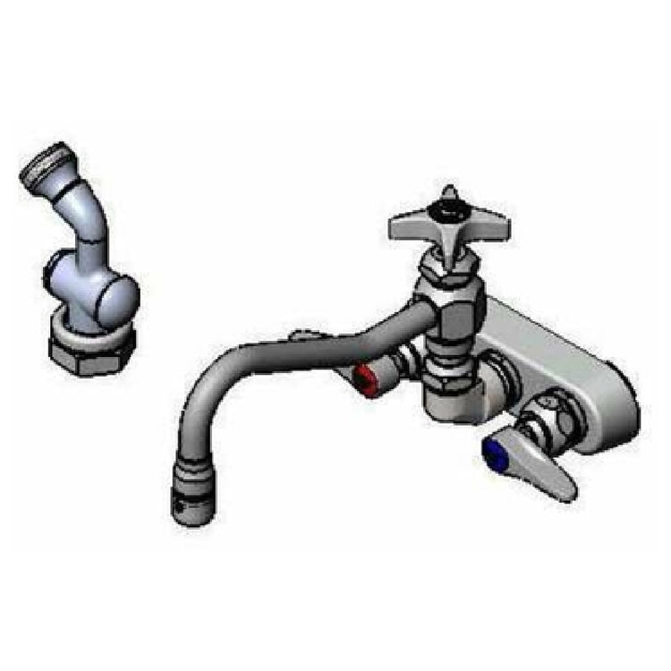 The T&S Brass B-1156-CR Workboard Mixing Faucet is a versatile wall-mounted unit engineered with precision for various professional settings. Featuring 4-inch centers, this faucet is designed to fit seamlessly on workboards, delivering efficiency where it's needed most. Its 7-7/8-inch swing nozzle is equipped with a 2.2 GPM aerator, ensuring optimal water flow for different tasks. The inclusion of a swivel diverter and a 4-arm handle enhances its functionality, allowing for easy switching between water outlets. This faucet boasts a self-closing spray valve with a generous 48-inch stainless steel flexible hose, providing extended reach and maneuverability. Durability and reliability are further reinforced by the quarter-turn Cerama cartridges with check valves, which ensure longevity and leak prevention. The lever handles feature color-coded indexes for intuitive operation, and the 1/2-inch NPT male inlets facilitate straightforward installation. Designed to meet stringent standards, this low-lead faucet is cCSAus and NSF certified, underscoring its compliance with health and safety regulations. The T&S Brass B-1156-CR is an optimal choice for industries requiring robust and reliable water dispensing solutions, offering a blend of advanced features and compliance with industry standards.